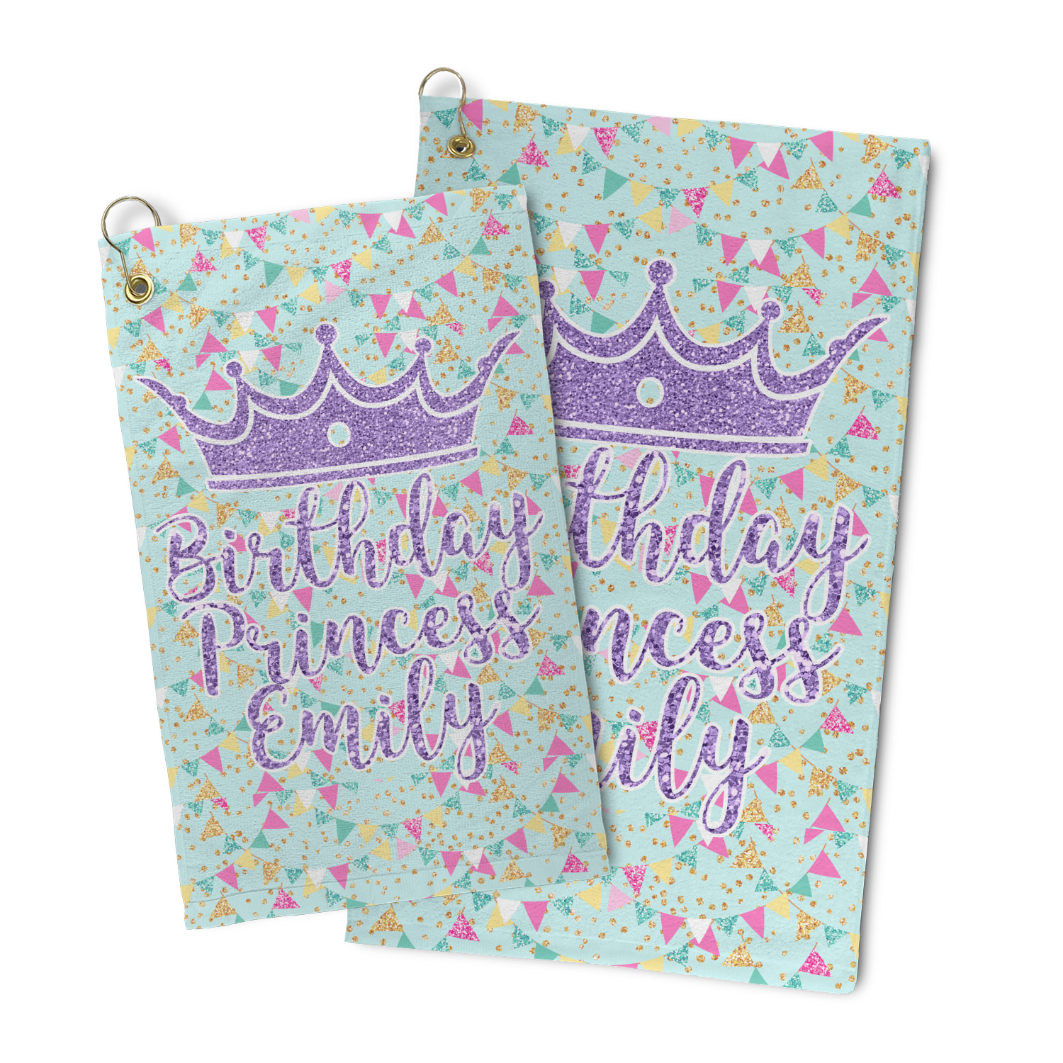 This design is bursting with fun! The background is a cool mint with brightly colored banners and confetti. The main graphic is a quote that says "Birthday Princess [Name Here]." This quote is filled with a fun glittery texture and can easily be changed to other fun patterns and colors.