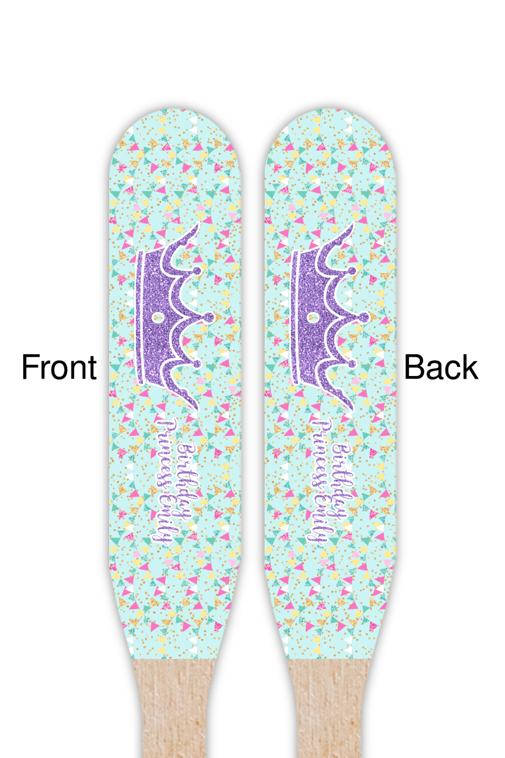 This design is bursting with fun! The background is a cool mint with brightly colored banners and confetti. The main graphic is a quote that says "Birthday Princess [Name Here]." This quote is filled with a fun glittery texture and can easily be changed to other fun patterns and colors.