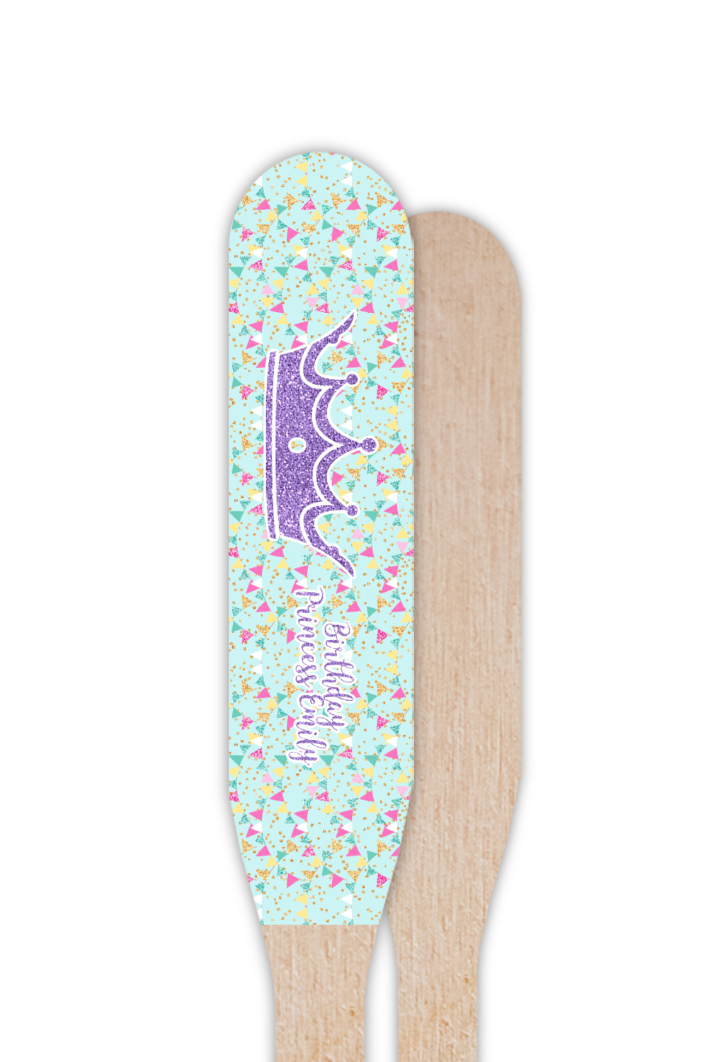 This design is bursting with fun! The background is a cool mint with brightly colored banners and confetti. The main graphic is a quote that says "Birthday Princess [Name Here]." This quote is filled with a fun glittery texture and can easily be changed to other fun patterns and colors.