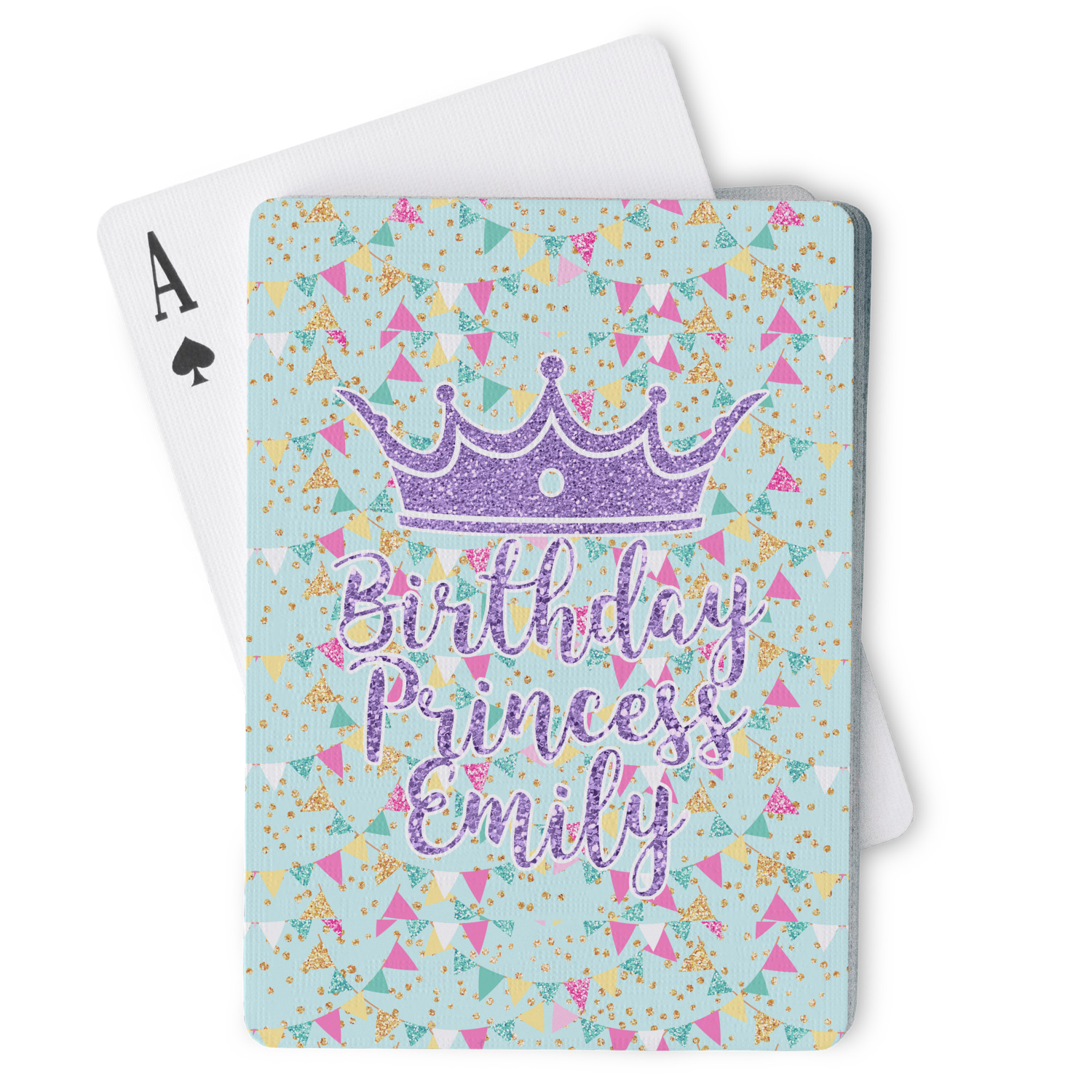 The customization / personalization is printed on the back side. The playing cards have a low gloss coating on both sides. The cards are packaged in a clear plastic box.