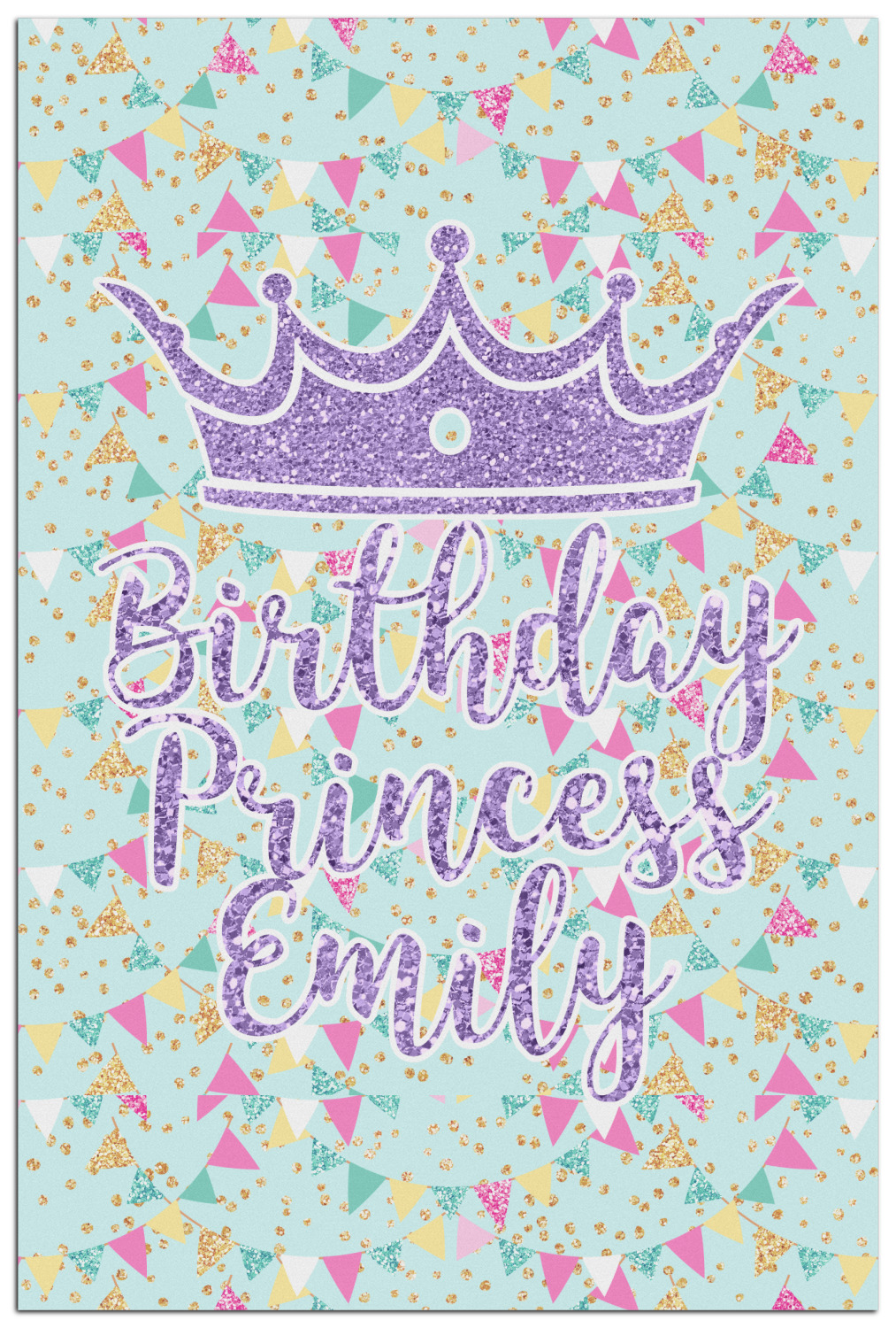 This design is bursting with fun! The background is a cool mint with brightly colored banners and confetti. The main graphic is a quote that says "Birthday Princess [Name Here]." This quote is filled with a fun glittery texture and can easily be changed to other fun patterns and colors.