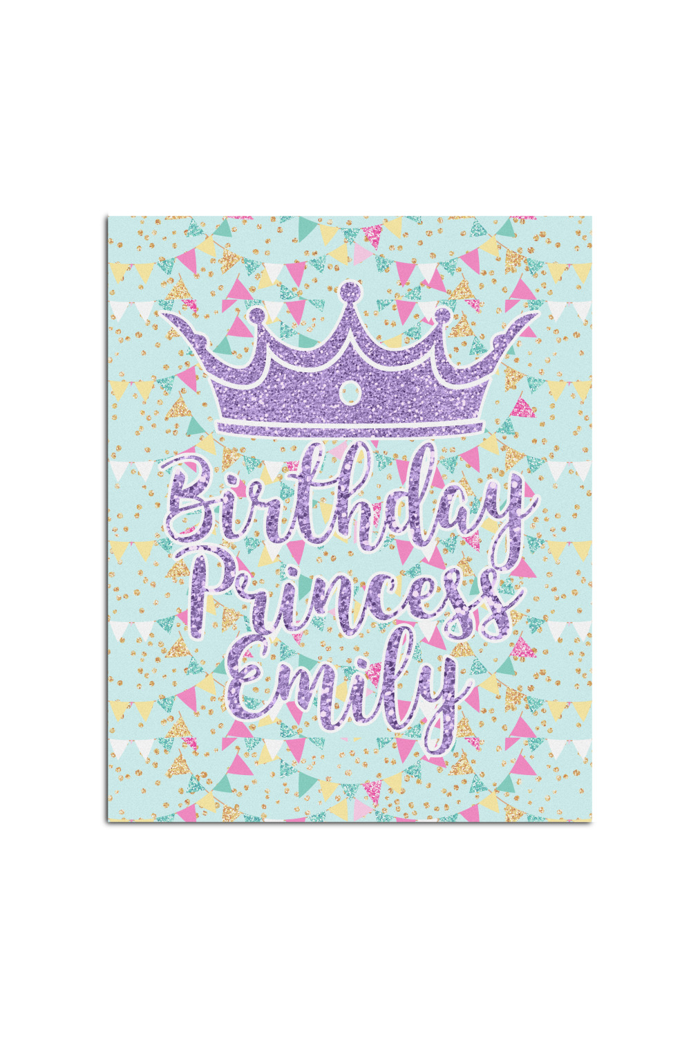 This design is bursting with fun! The background is a cool mint with brightly colored banners and confetti. The main graphic is a quote that says "Birthday Princess [Name Here]." This quote is filled with a fun glittery texture and can easily be changed to other fun patterns and colors.