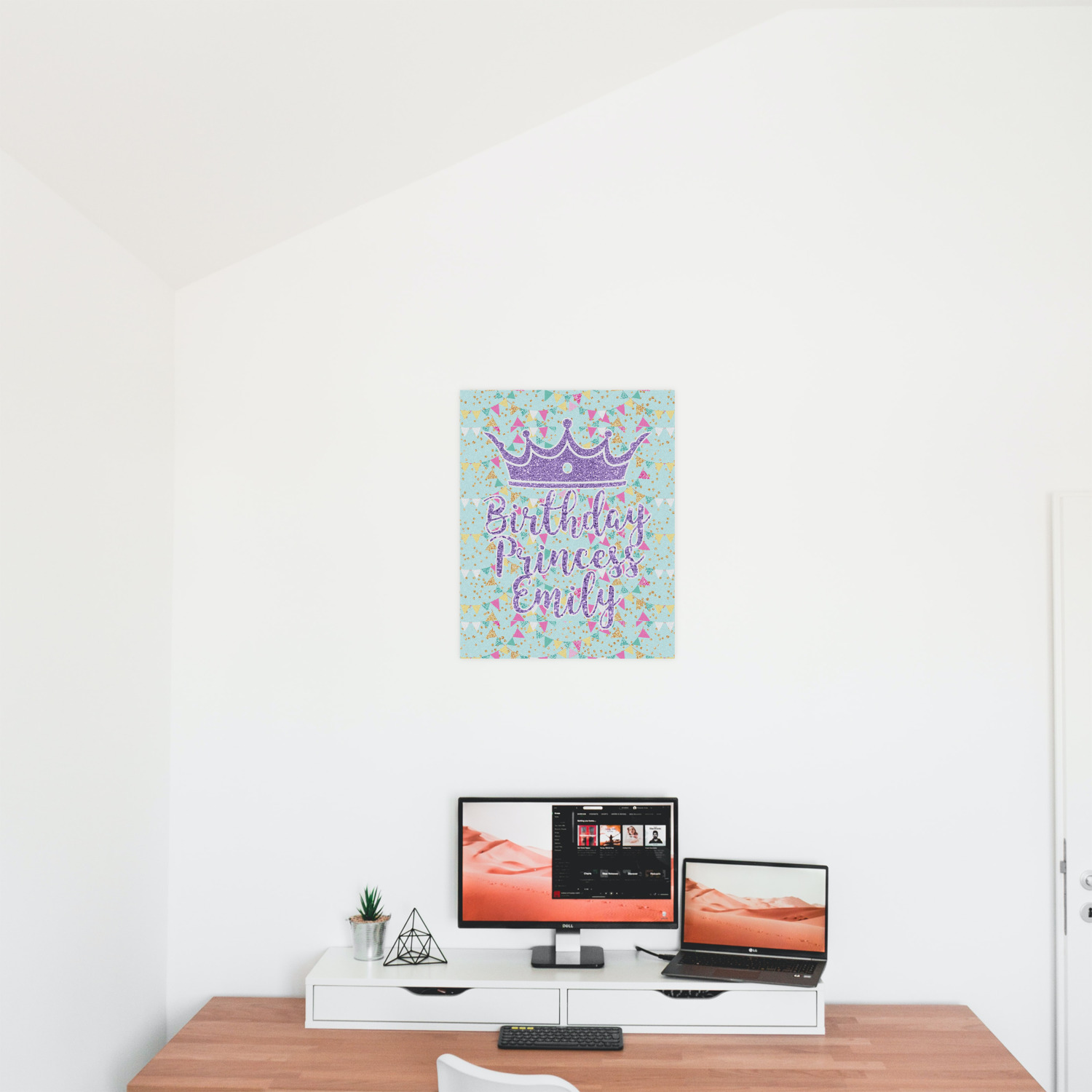 This design is bursting with fun! The background is a cool mint with brightly colored banners and confetti. The main graphic is a quote that says "Birthday Princess [Name Here]." This quote is filled with a fun glittery texture and can easily be changed to other fun patterns and colors.