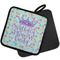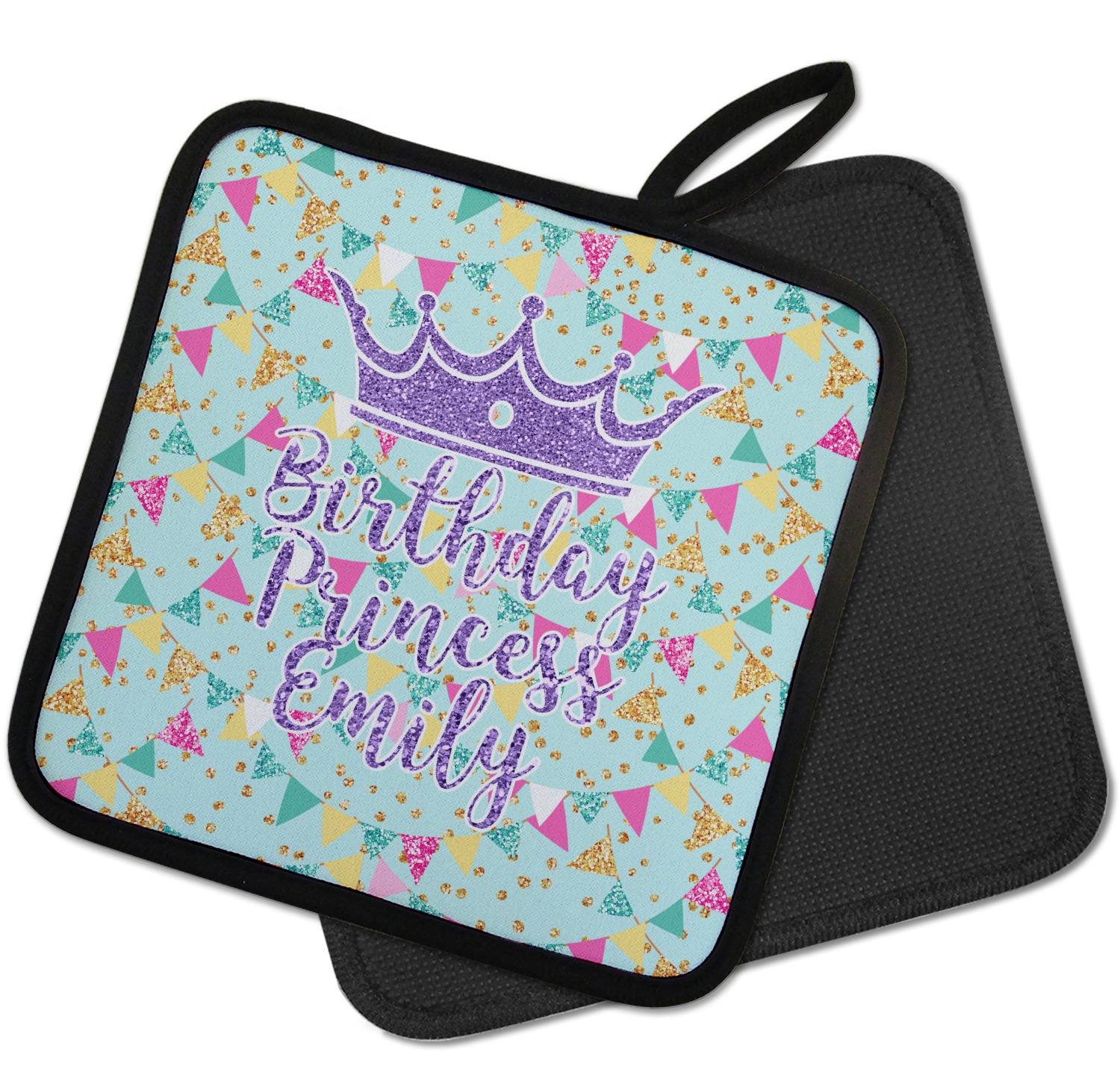 Our personalized pot holders feature a neoprene front that displays your personalization in vibrant colors. The backing of the hot pot holder is rubberized; the textured backing allows you to have a great grip when using this custom pot holder. The two materials are joined with a sleek, black trim, and the holder also includes an attached loop for hanging and storage. The pot holder is approximately 8.75 inches by 8.75 inches and 0.25 inches tall, while the fabric loop is 2.5 inches long. You can purchase a kitchen pot holder by itself or as a set of 2. We also offer a set including one pot holder and one oven mitt.