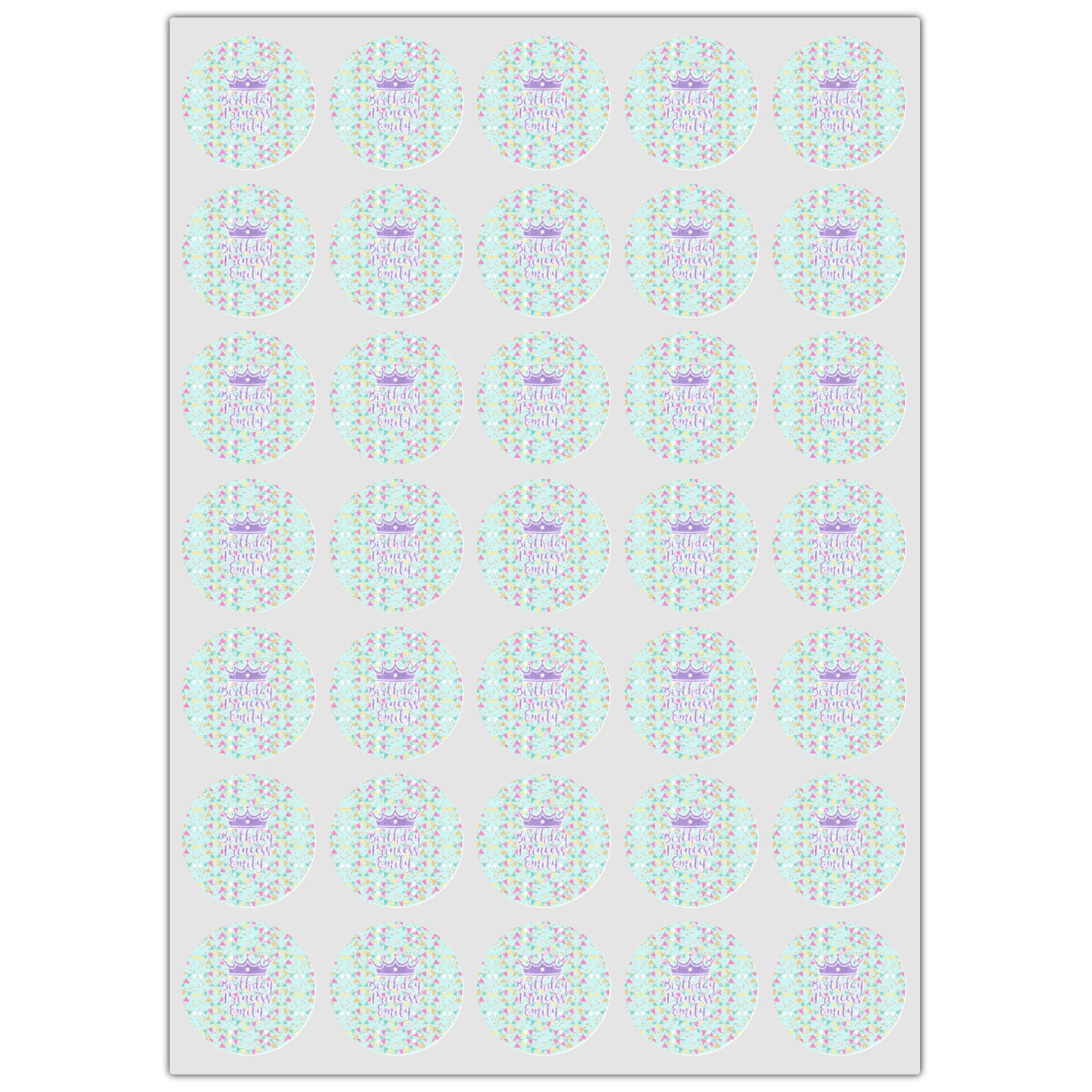 This design is bursting with fun! The background is a cool mint with brightly colored banners and confetti. The main graphic is a quote that says "Birthday Princess [Name Here]." This quote is filled with a fun glittery texture and can easily be changed to other fun patterns and colors.