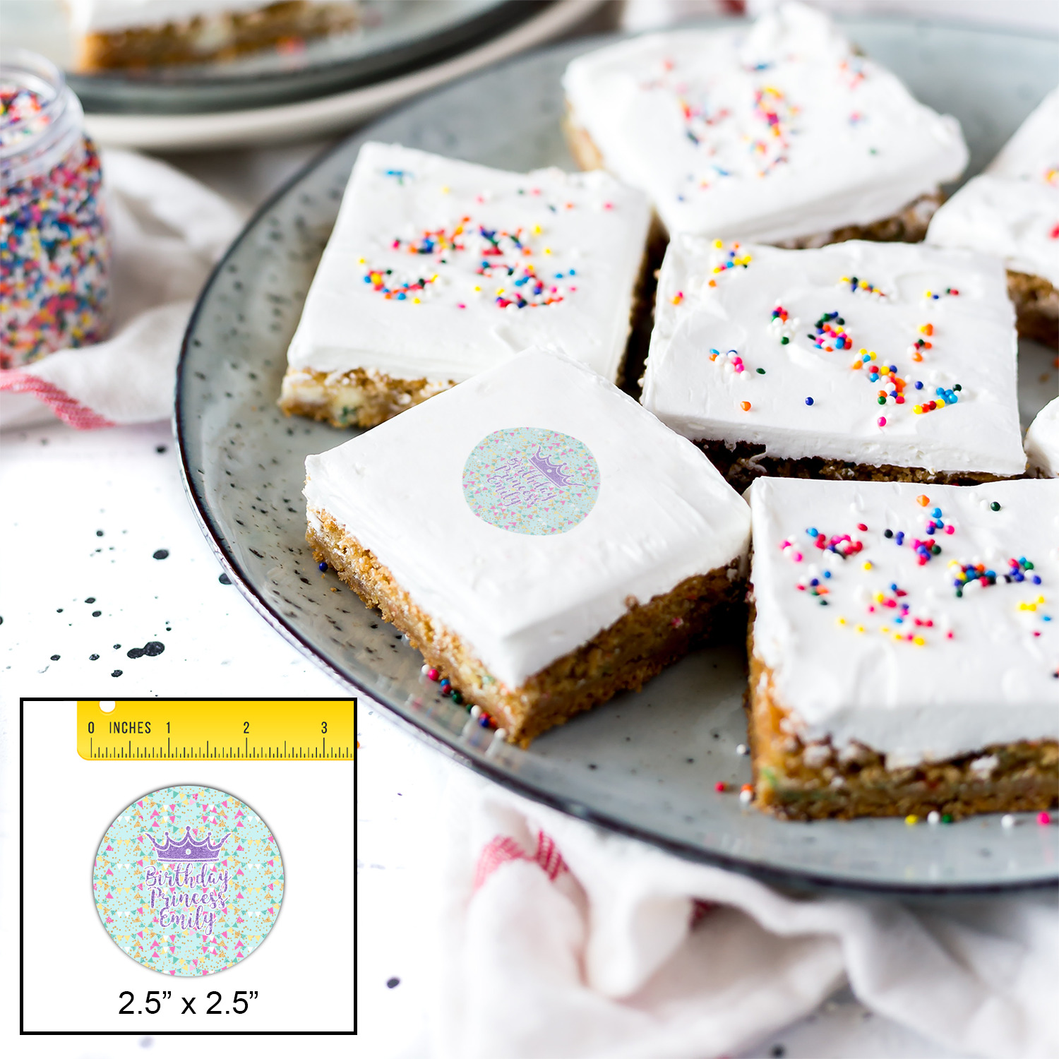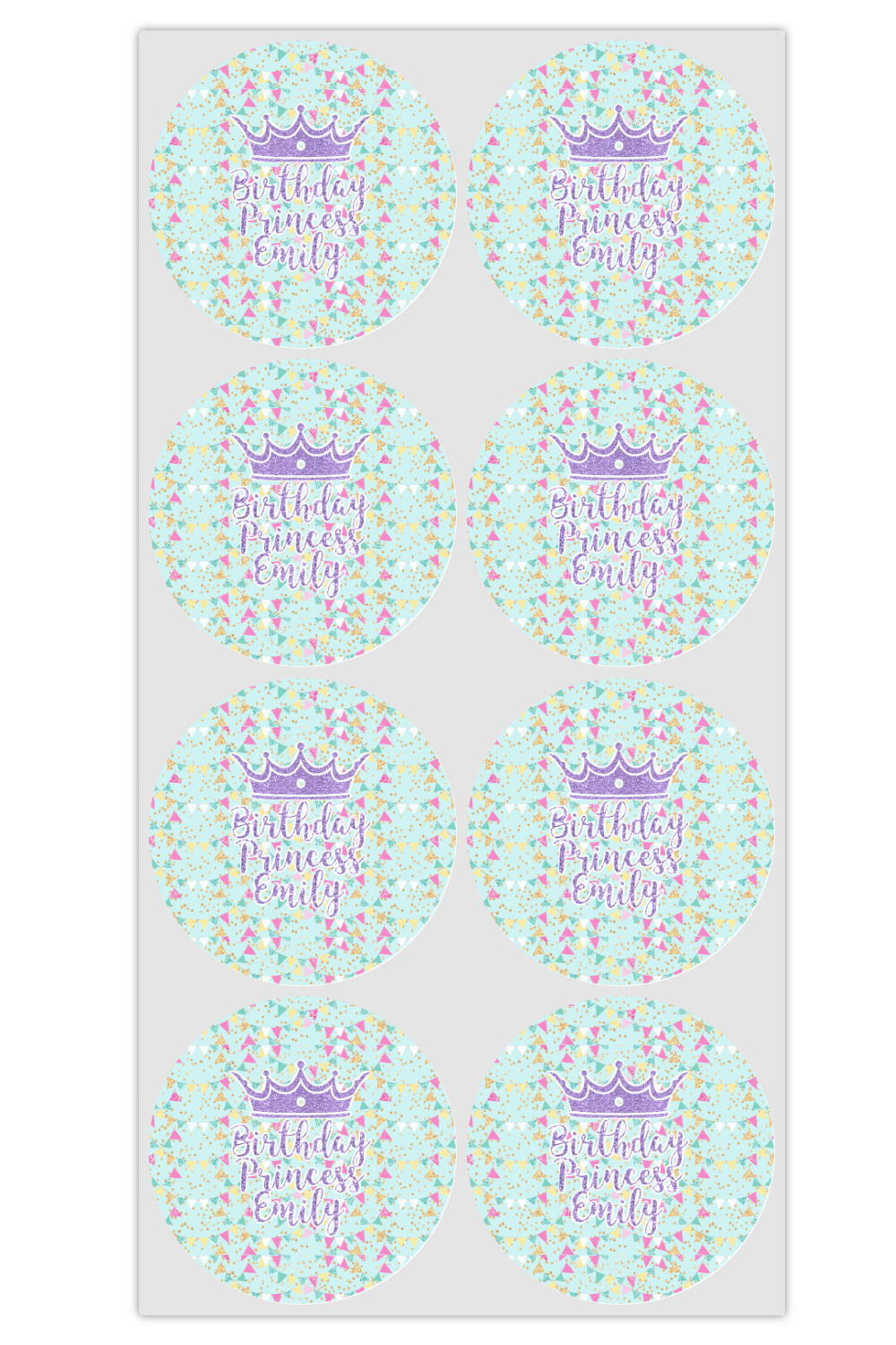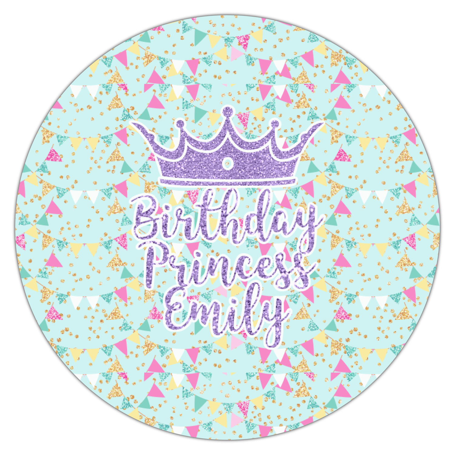 This design is bursting with fun! The background is a cool mint with brightly colored banners and confetti. The main graphic is a quote that says "Birthday Princess [Name Here]." This quote is filled with a fun glittery texture and can easily be changed to other fun patterns and colors.