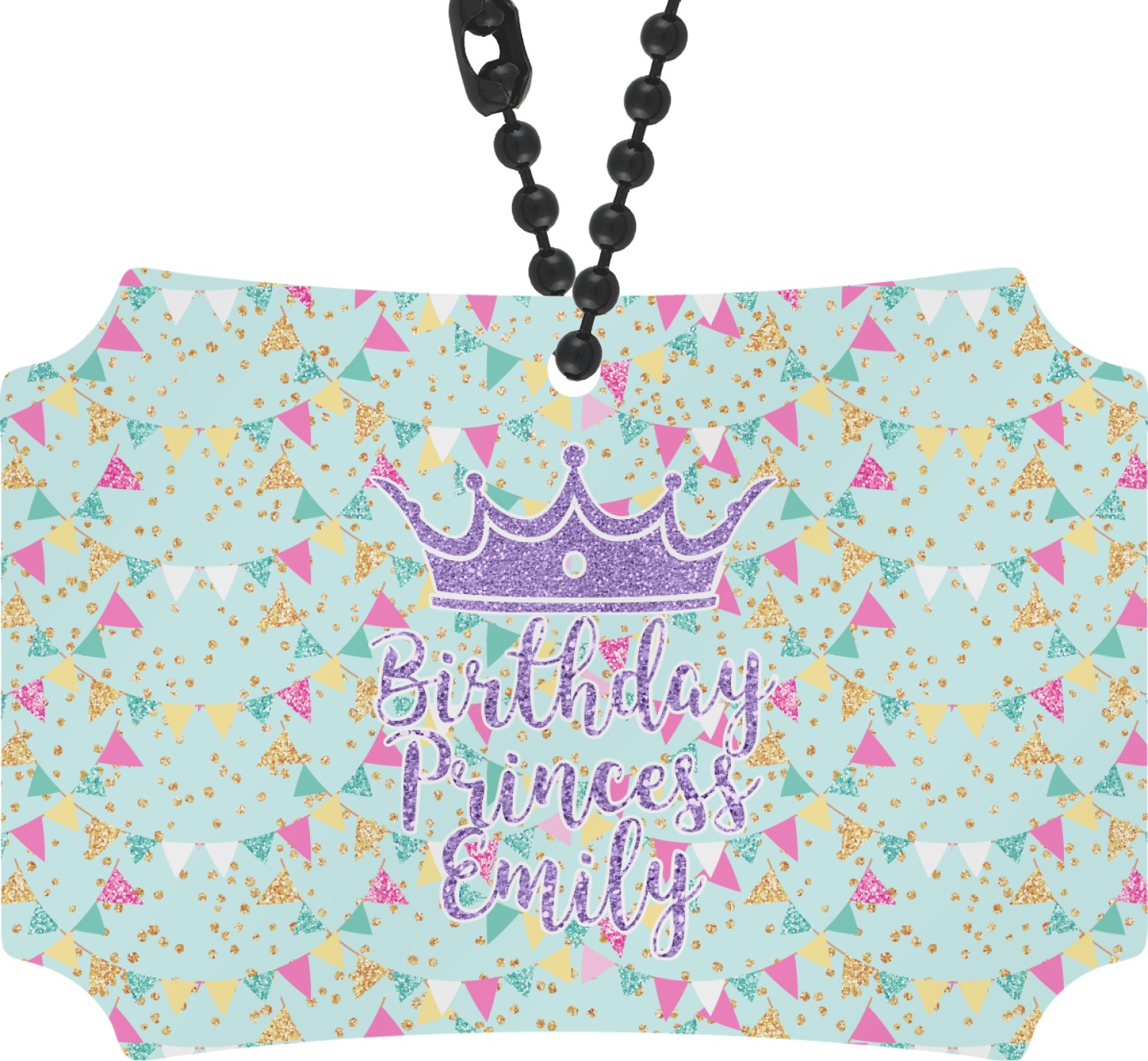This design is bursting with fun! The background is a cool mint with brightly colored banners and confetti. The main graphic is a quote that says "Birthday Princess [Name Here]." This quote is filled with a fun glittery texture and can easily be changed to other fun patterns and colors.