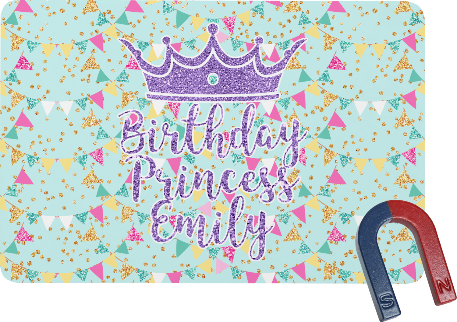 This design is bursting with fun! The background is a cool mint with brightly colored banners and confetti. The main graphic is a quote that says "Birthday Princess [Name Here]." This quote is filled with a fun glittery texture and can easily be changed to other fun patterns and colors.