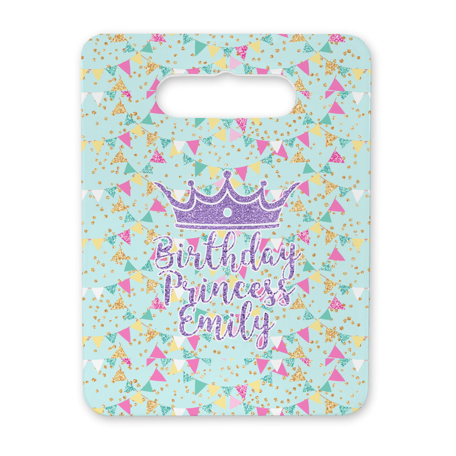 This design is bursting with fun! The background is a cool mint with brightly colored banners and confetti. The main graphic is a quote that says "Birthday Princess [Name Here]." This quote is filled with a fun glittery texture and can easily be changed to other fun patterns and colors.