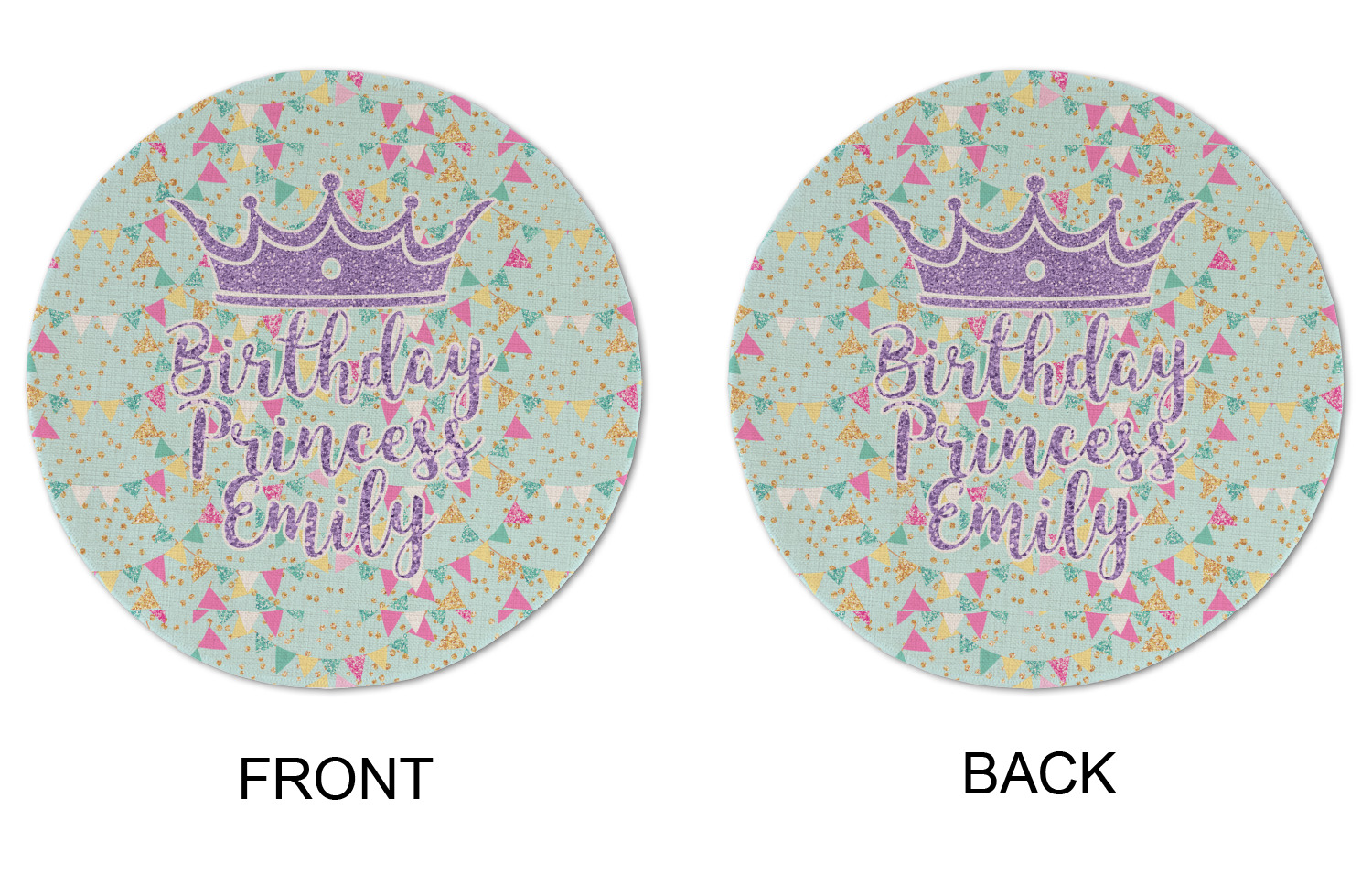 This design is bursting with fun! The background is a cool mint with brightly colored banners and confetti. The main graphic is a quote that says "Birthday Princess [Name Here]." This quote is filled with a fun glittery texture and can easily be changed to other fun patterns and colors.