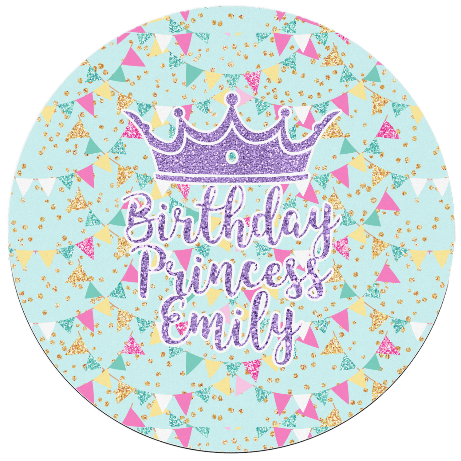 This design is bursting with fun! The background is a cool mint with brightly colored banners and confetti. The main graphic is a quote that says "Birthday Princess [Name Here]." This quote is filled with a fun glittery texture and can easily be changed to other fun patterns and colors.