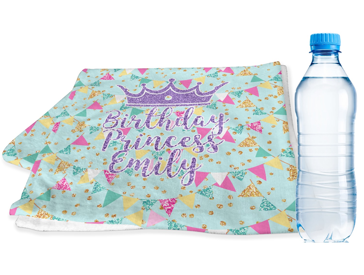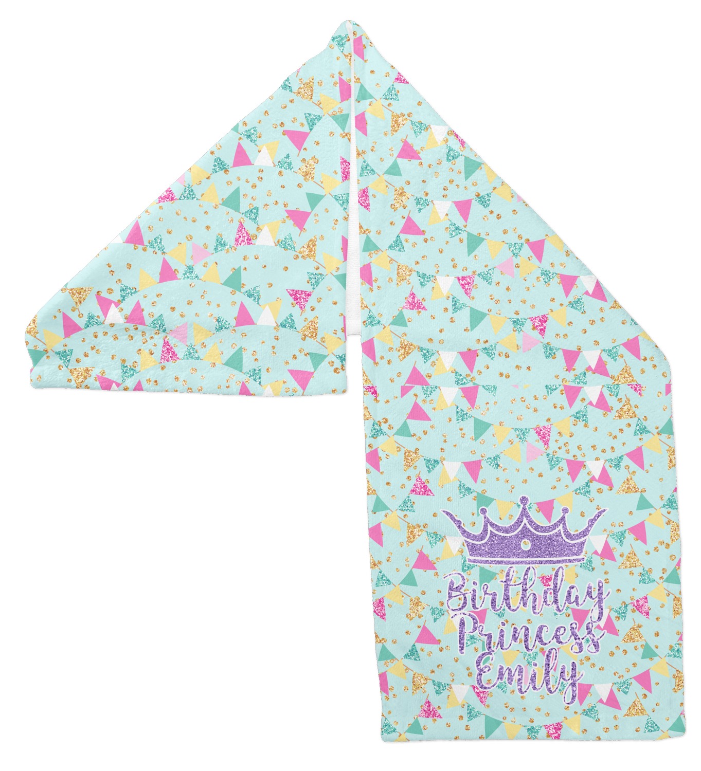 This design is bursting with fun! The background is a cool mint with brightly colored banners and confetti. The main graphic is a quote that says "Birthday Princess [Name Here]." This quote is filled with a fun glittery texture and can easily be changed to other fun patterns and colors.