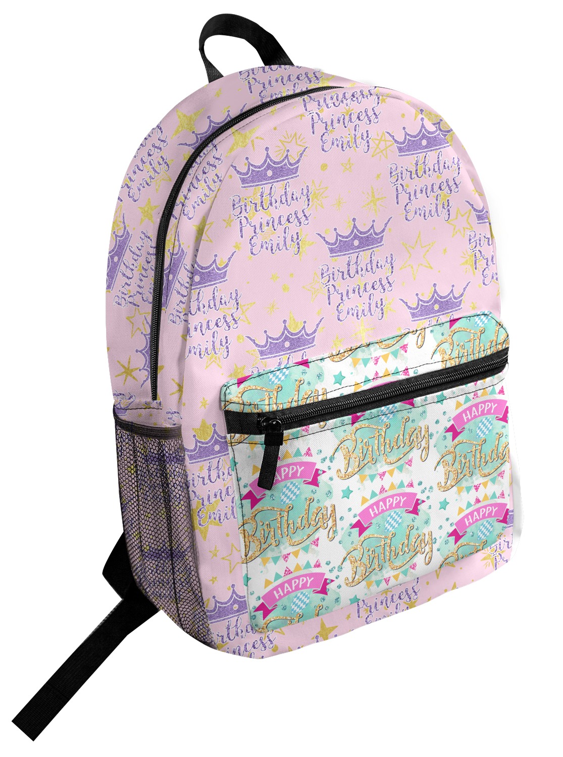 This design is bursting with fun! The background is a cool mint with brightly colored banners and confetti. The main graphic is a quote that says "Birthday Princess [Name Here]." This quote is filled with a fun glittery texture and can easily be changed to other fun patterns and colors.