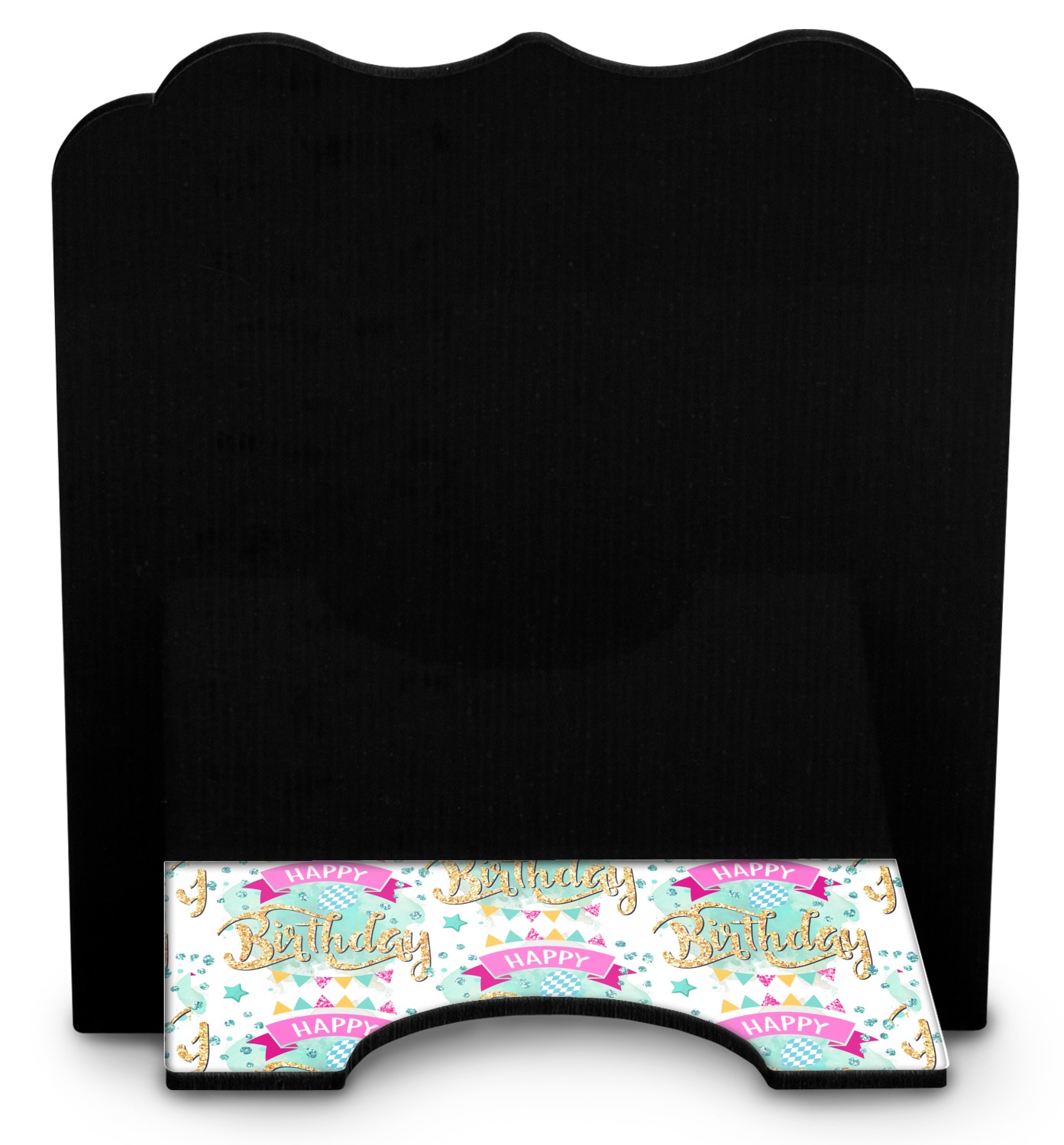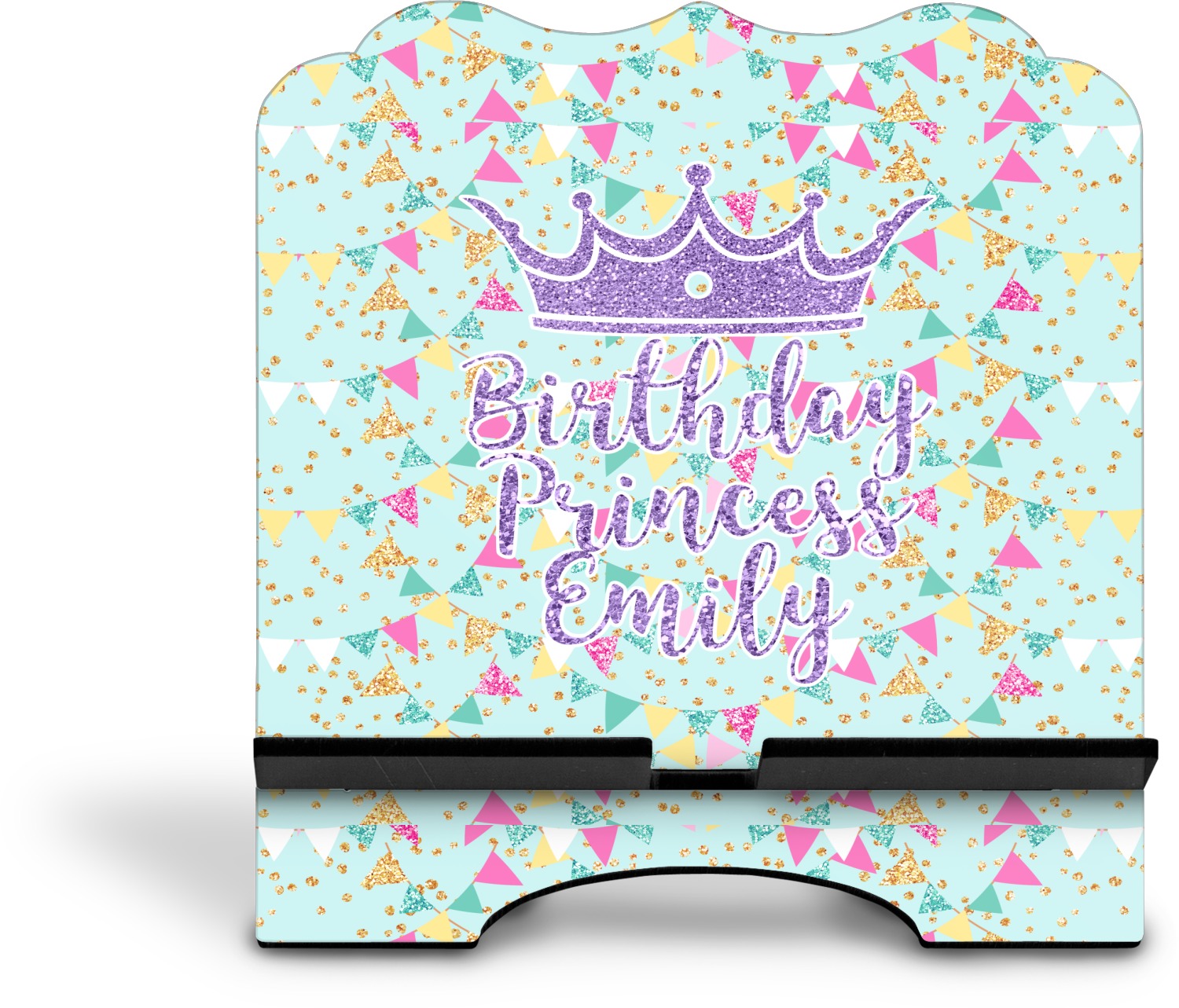 The stand is comprised of two hardboard pieces that fit snugly together and stabilize one another. The bottom part of the iPad stand supports your tablet, and has space for your tablets charger while in use. At 9.25" x 11.5", this tablet mount can support a device between the sizes of the iPad Pro and the iPad Mini 2. The uppermost part of the stand features a decorative, curved edge for a classy, suave appearance. We print your customization atop the face of the stand, in vibrant color. The remaining sides are colored a sleek black.