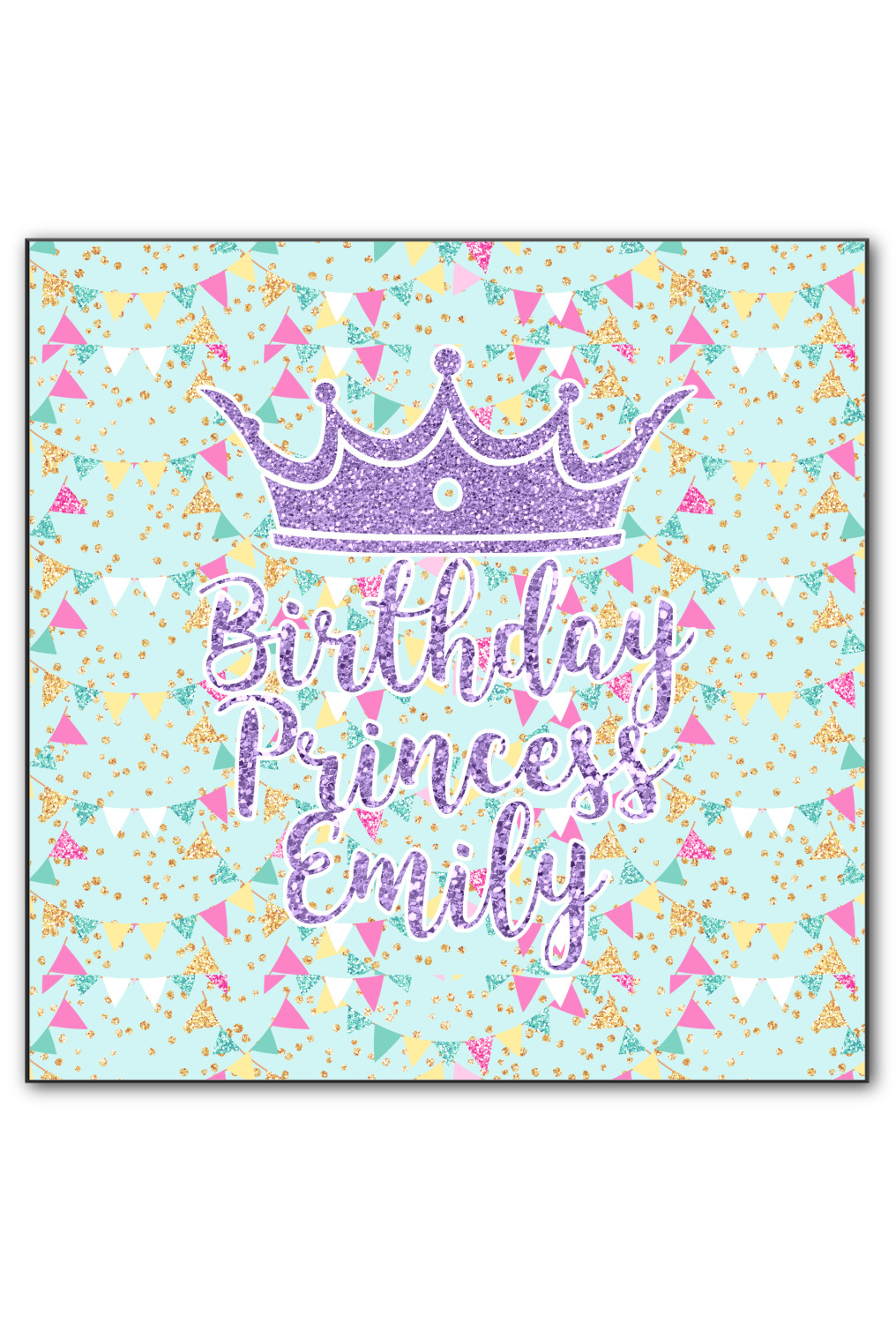 This design is bursting with fun! The background is a cool mint with brightly colored banners and confetti. The main graphic is a quote that says "Birthday Princess [Name Here]." This quote is filled with a fun glittery texture and can easily be changed to other fun patterns and colors.