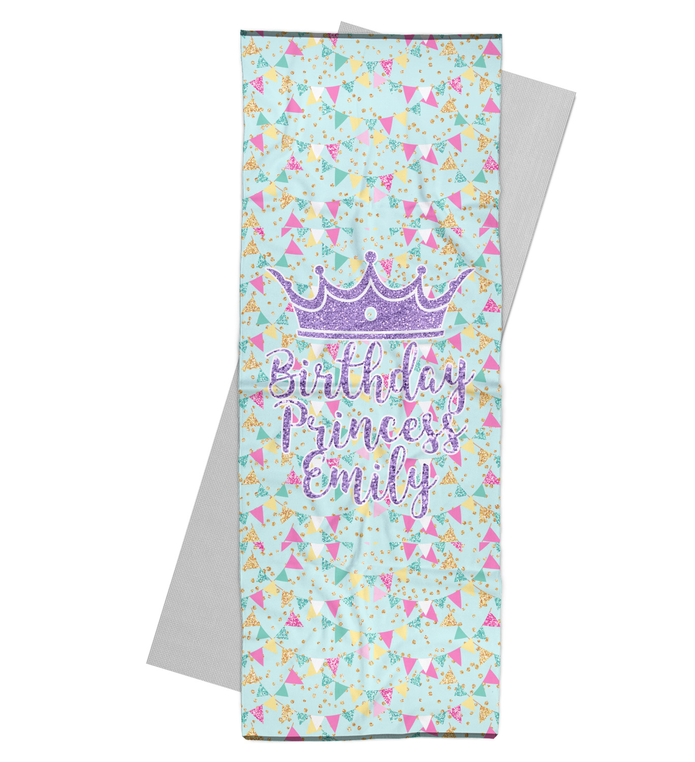 This design is bursting with fun! The background is a cool mint with brightly colored banners and confetti. The main graphic is a quote that says "Birthday Princess [Name Here]." This quote is filled with a fun glittery texture and can easily be changed to other fun patterns and colors.