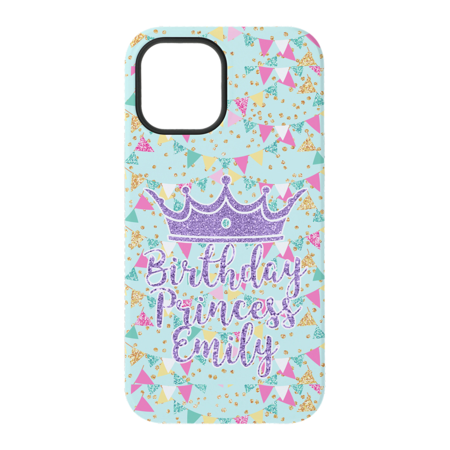 This design is bursting with fun! The background is a cool mint with brightly colored banners and confetti. The main graphic is a quote that says "Birthday Princess [Name Here]." This quote is filled with a fun glittery texture and can easily be changed to other fun patterns and colors.