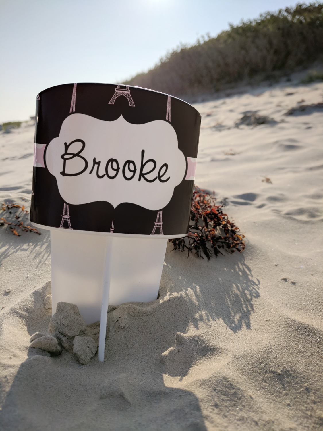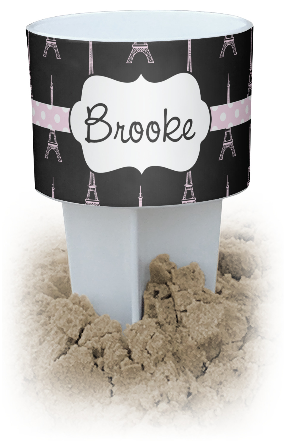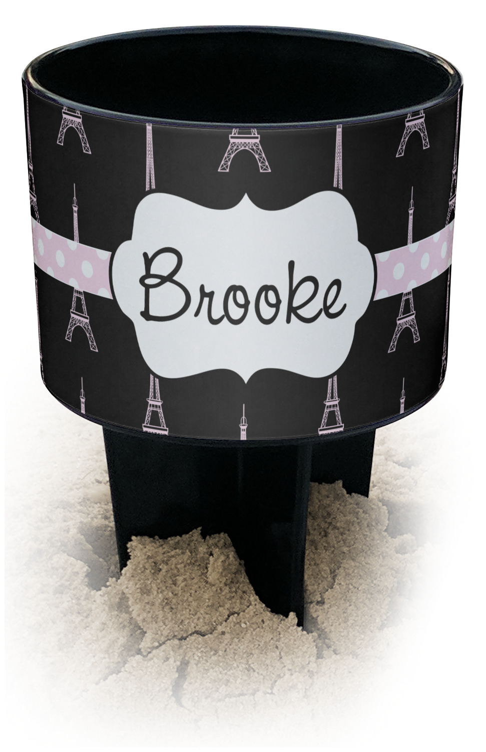 This cup holder has a large stake at its bottom that anchors it to the sand or ground below, while the cup holder rests above the stake. The entire drink holder is made of durable plastic and displays your customization around the cup holder portion. We sell these personalized beach spikers in two different colors: black and white.