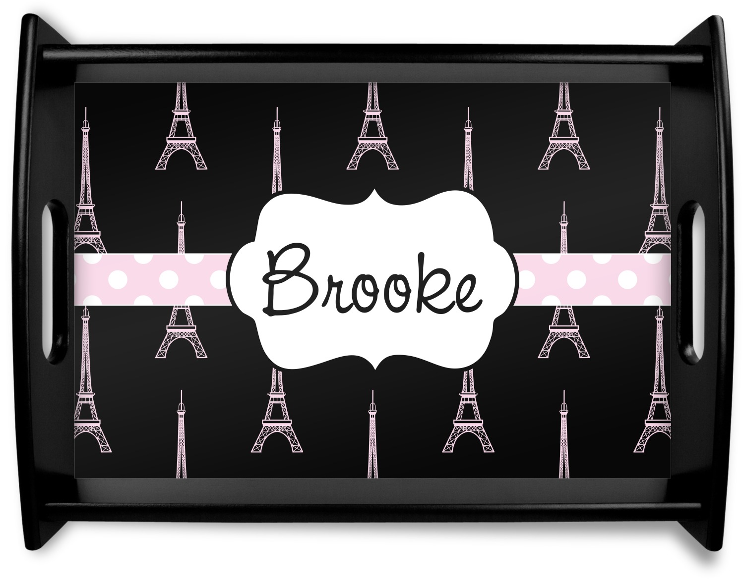 This serving tray with handles features square edges and two rounded sides, creating a very modern look. Each side is fabricated from a beautifully cut, natural wood. The bottom of the interior of the tray displays your customized design in bright, vibrant color. The tray is sold in both a black color and a natural wood look. Each variation of the wood serving tray has two sizes: Small, which is 14" x 10" x 2.25", and Large, which is 19.5" x 13.5" x 2.75".