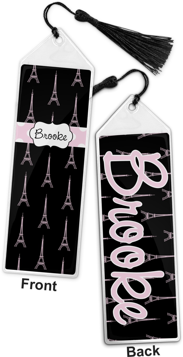 Your personalized bookmark is made of a sturdy, clear vinyl, and is approximately 7.5" x 2.25". We display your personalization on vinyl inserts that are placed on both sides. Accompanying each book marker is a black, fringe tassel that attaches to the reinforced, triangular header.
