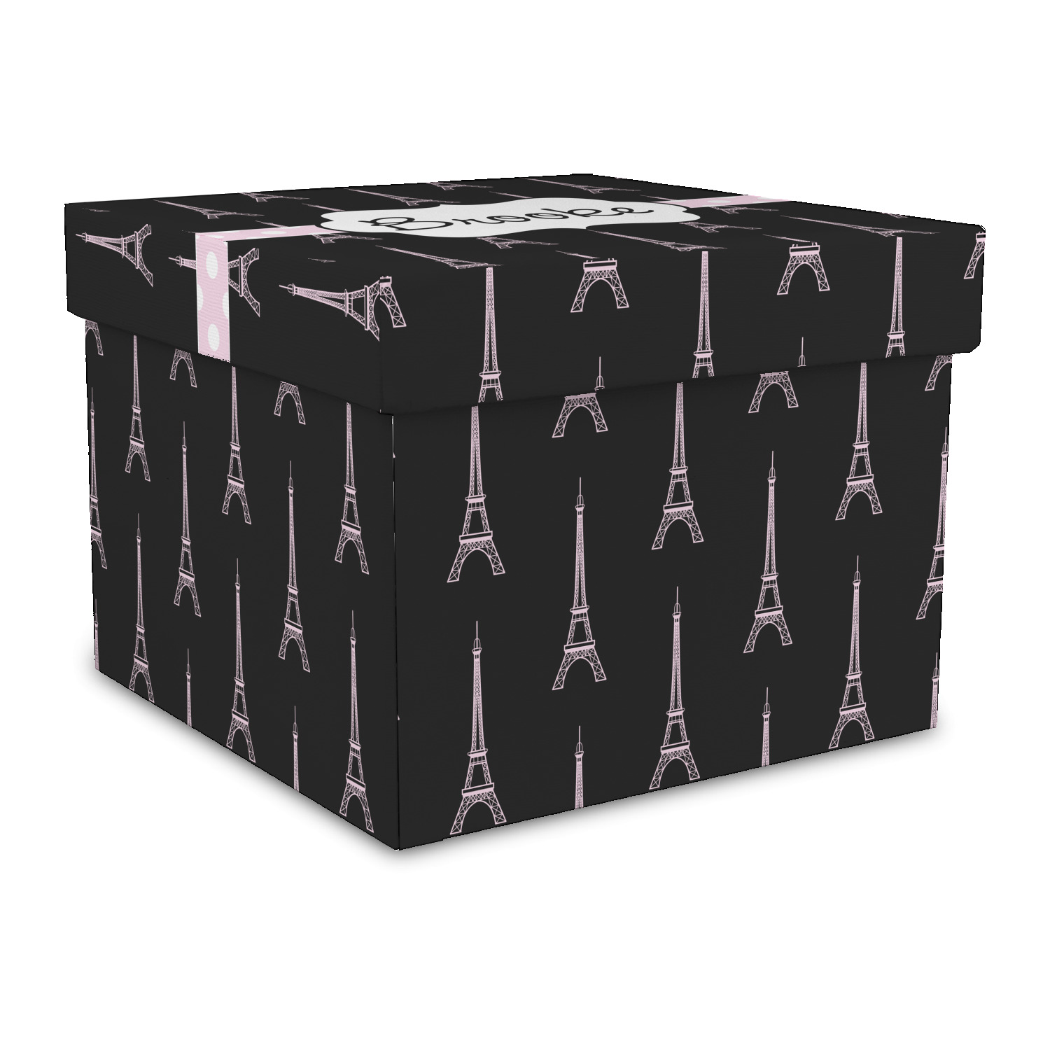 A gorgeous wide soft pink and white polka dot band adds a touch of French whimsy. The beautiful white label trimmed in coordinating pink highlights the personalization of your choice.