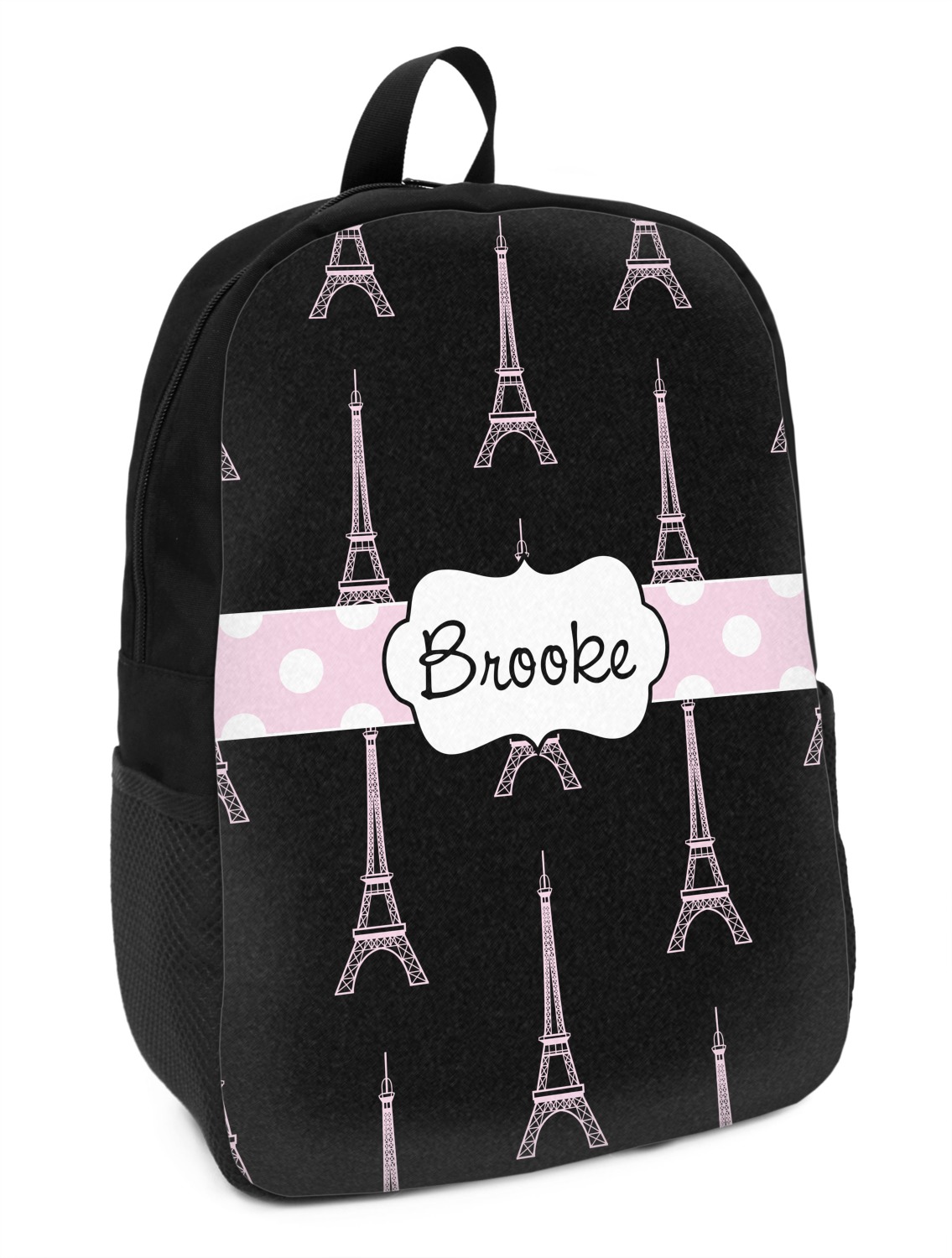 These small backpacks are made of a durable black canvas material with your personalization right on the front. The two shoulder straps are padded and easily adjustable. The bag itself measures at about 11" W x 15" H x 5" D. It's the perfect size for elementary aged kids or adults who want a smaller backpack. On the top of the bag you will find a handle to hang or carry your backpack by as well as a large zipper closure to keep all of your belongings safe inside. On each side of your backpack is a mesh pocket for a small item or water bottle. Inside your backpack you will find a spacious area with a small zipper pocket and a padded laptop slot that will fit up to a 13" laptop (13" being very snug). This is the perfect bag for any student that needs a couple books and their laptop with them at all times. It also works great as a carry on for traveling!