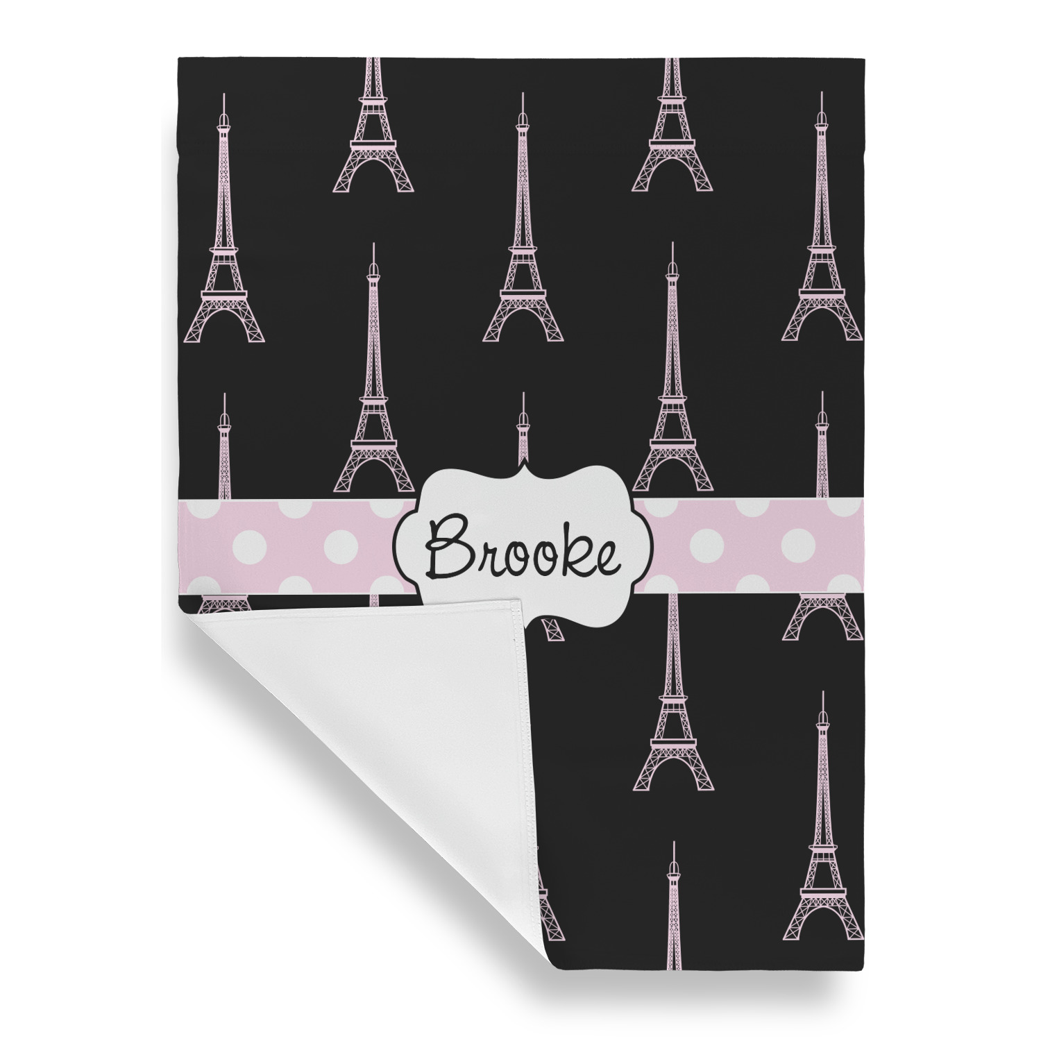 A gorgeous wide soft pink and white polka dot band adds a touch of French whimsy. The beautiful white label trimmed in coordinating pink highlights the personalization of your choice.