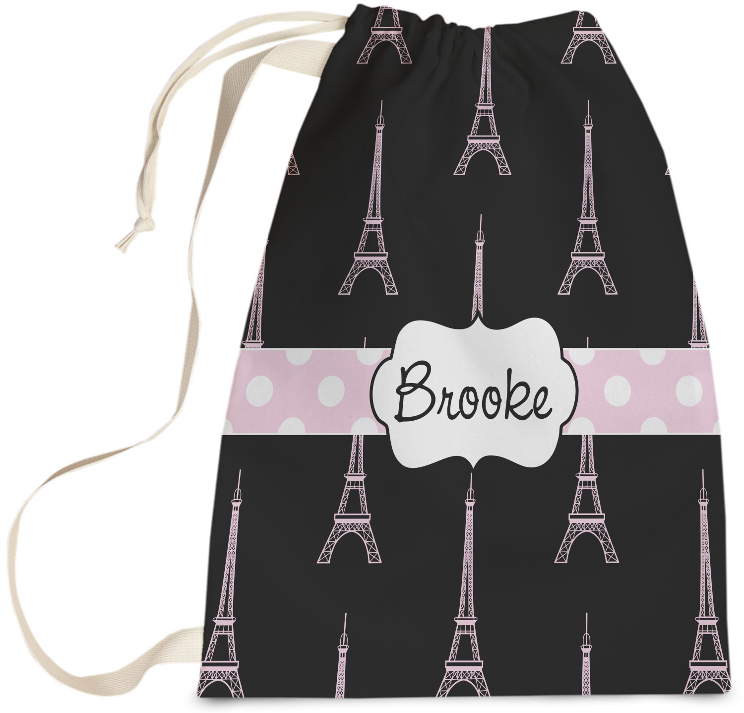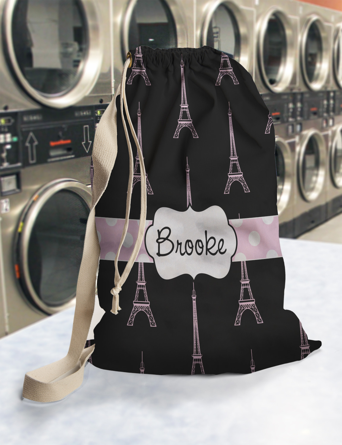 Carry your laundry in style with these customized laundry bags. Available in two sizes, featuring a natural colored woven strap and a cinch cord, these bags hold a lot of clothes or anything else you want to fit in them.