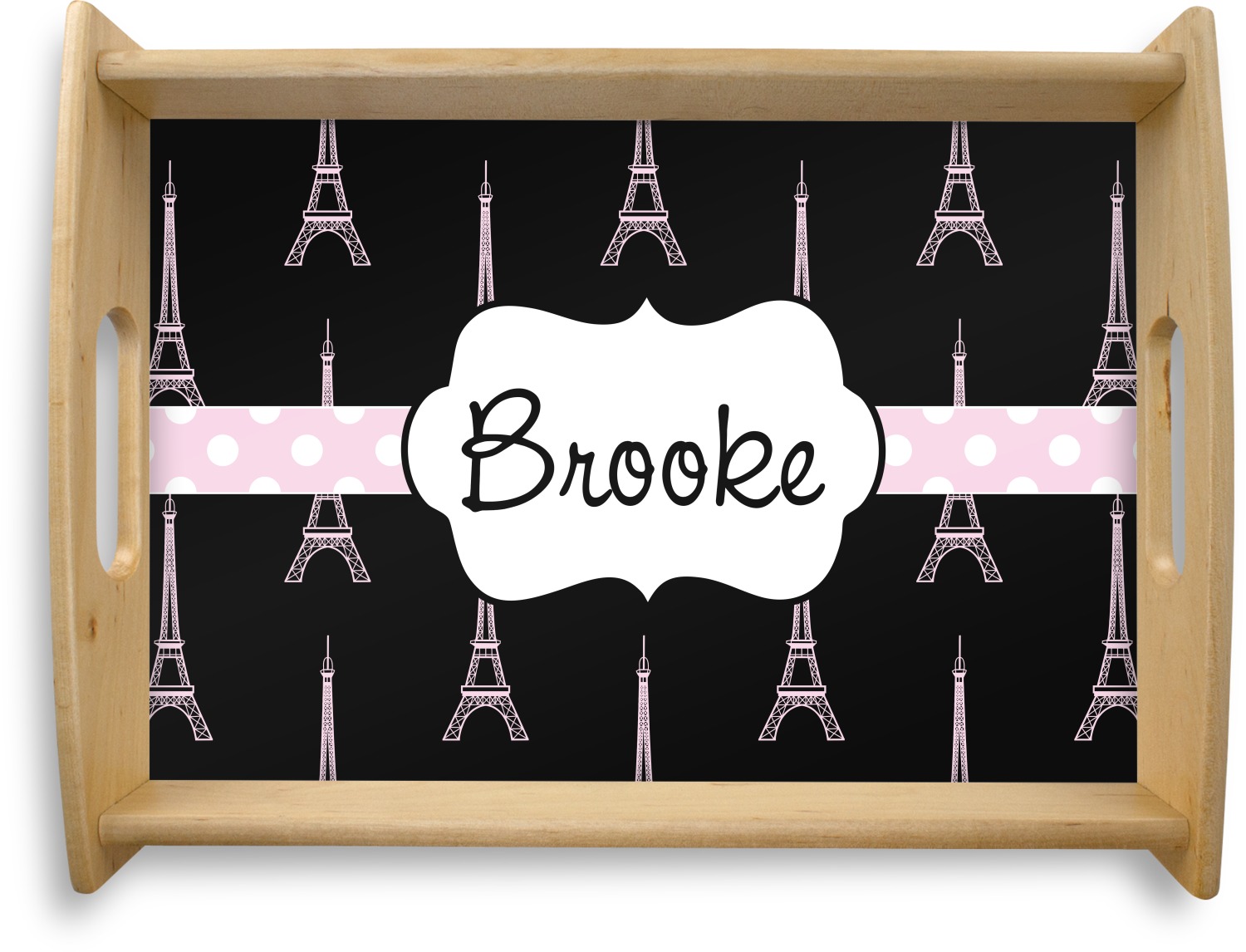 This serving tray with handles features square edges and two rounded sides, creating a very modern look. Each side is fabricated from a beautifully cut, natural wood. The bottom of the interior of the tray displays your customized design in bright, vibrant color. The tray is sold in both a black color and a natural wood look. Each variation of the wood serving tray has two sizes: Small, which is 14" x 10" x 2.25", and Large, which is 19.5" x 13.5" x 2.75".