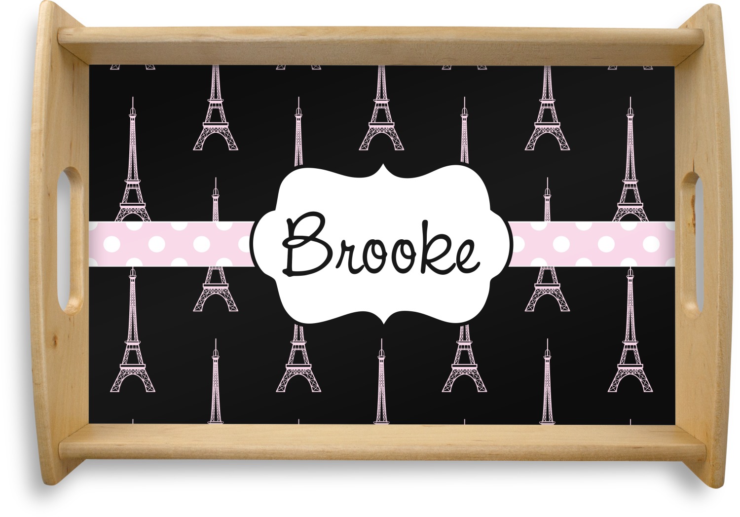 This serving tray with handles features square edges and two rounded sides, creating a very modern look. Each side is fabricated from a beautifully cut, natural wood. The bottom of the interior of the tray displays your customized design in bright, vibrant color. The tray is sold in both a black color and a natural wood look. Each variation of the wood serving tray has two sizes: Small, which is 14" x 10" x 2.25", and Large, which is 19.5" x 13.5" x 2.75".