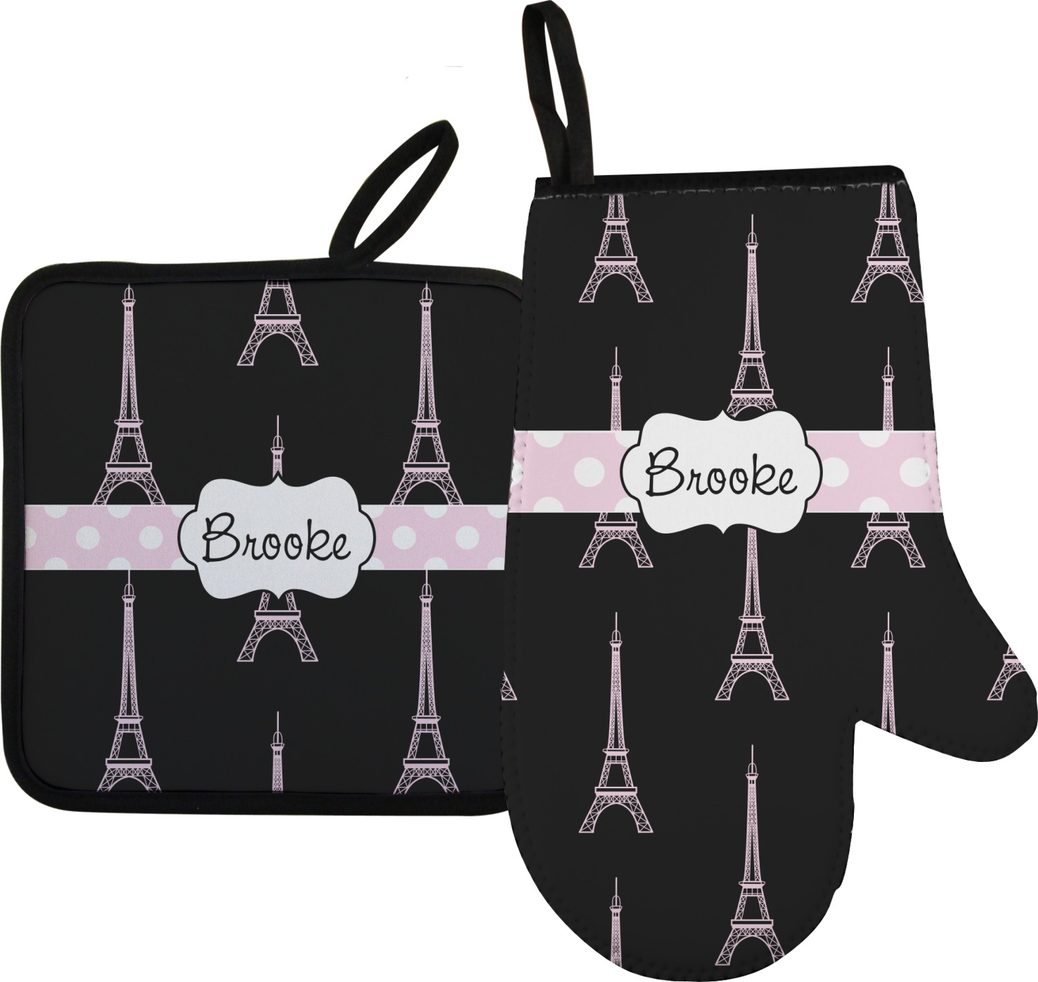 Along with our heat resistant gloves, we also carry personalized pot holders. These pot holders also feature a neoprene front that displays your personalization, and a textured, rubber backing for a sturdy grip. The two materials are connected with a sleek, black trim, and the hot pot holder also includes an attached loop for hanging and storage. You can purchase a kitchen pot holder by itself, or alongside a right or left oven mitt, depending on your needs. The pot holder itself is approximately 8.75 inches by 8.75 inches and 0.25 inches tall.