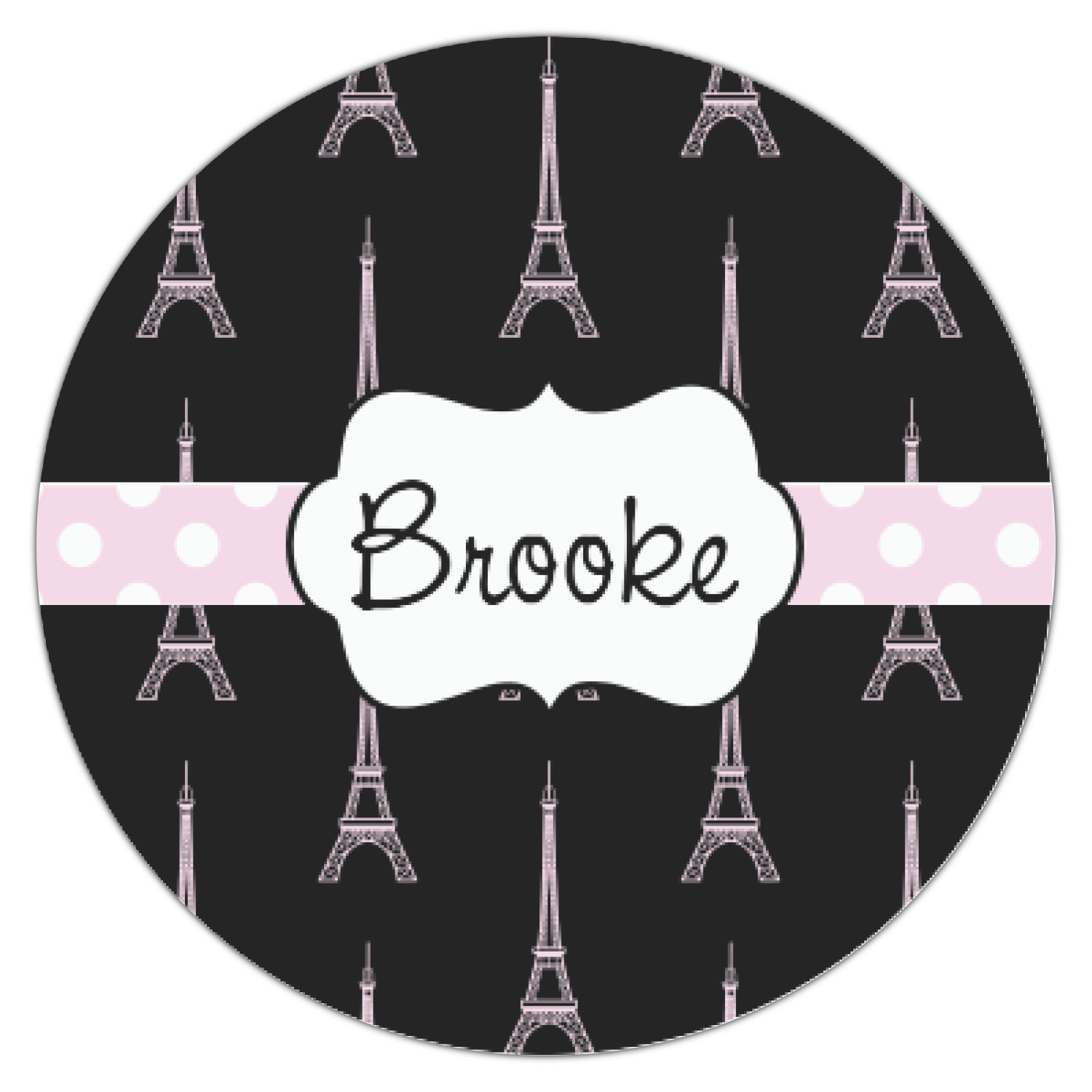 A gorgeous wide soft pink and white polka dot band adds a touch of French whimsy. The beautiful white label trimmed in coordinating pink highlights the personalization of your choice.