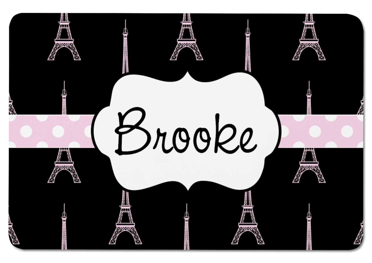 A gorgeous wide soft pink and white polka dot band adds a touch of French whimsy. The beautiful white label trimmed in coordinating pink highlights the personalization of your choice.