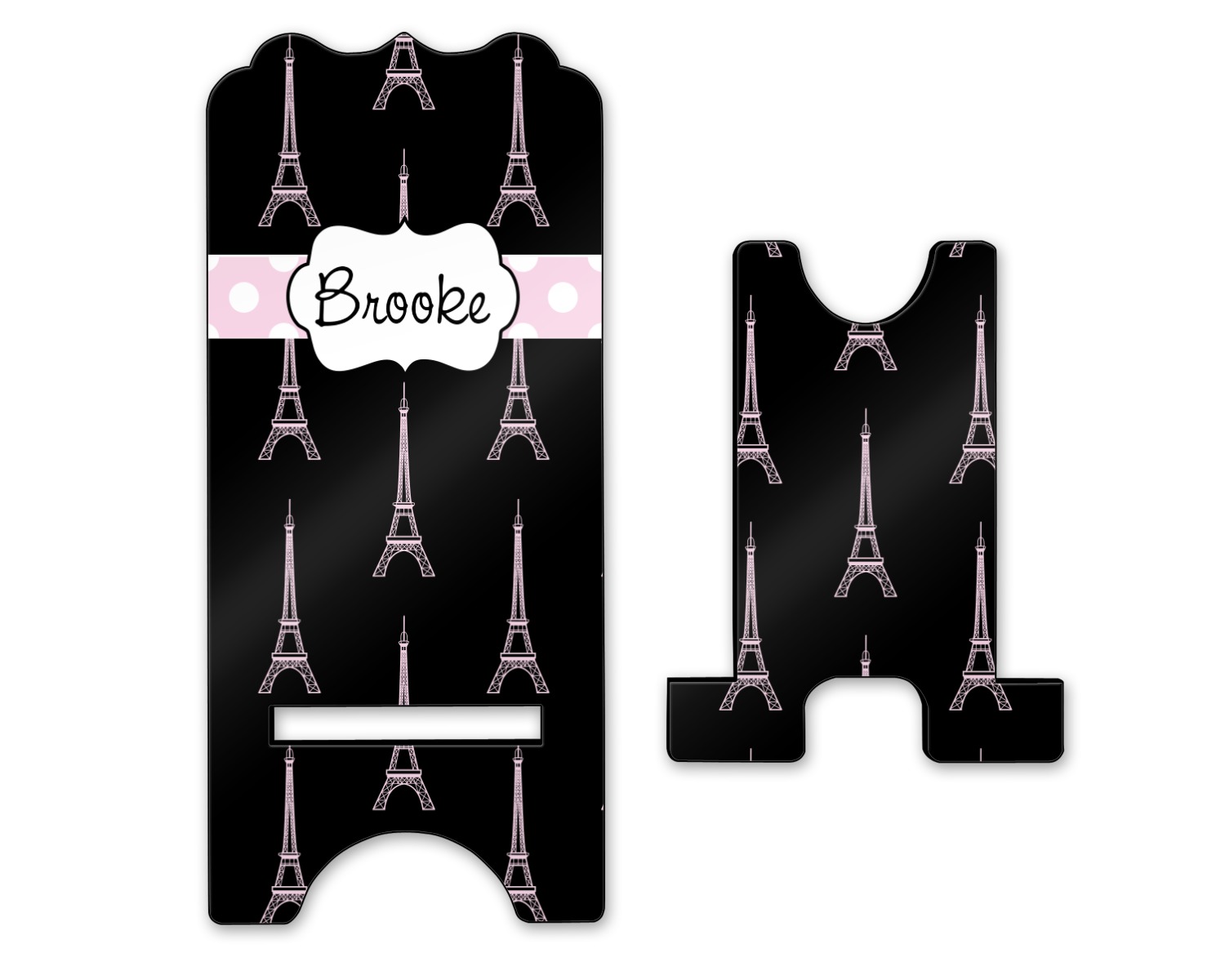 To meet your needs, we offer four variations of this IPhone stand. The backboard of the first version is shaped as a plain, yet sleek rectangle, and is available in two sizes. Our smaller size is approximately 4 by 3.25 by 7 inches, while the larger model is 4 by 3.77 by 8.5 inches. Alongside this model, we also provide you with a more decorative option. The upper part of our second version features a curved edge, for a classy, suave appearance. This phone holder is also sold in two sizes: a smaller version, which is 4 by 3.25 by 7 inches, and our larger model, which is 4 by 3.77 by 8.5 inches. Both models will support large phones, but the larger model is better if you wish to proudly display your personalized design.