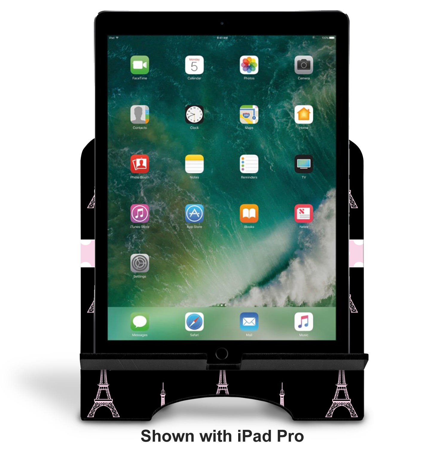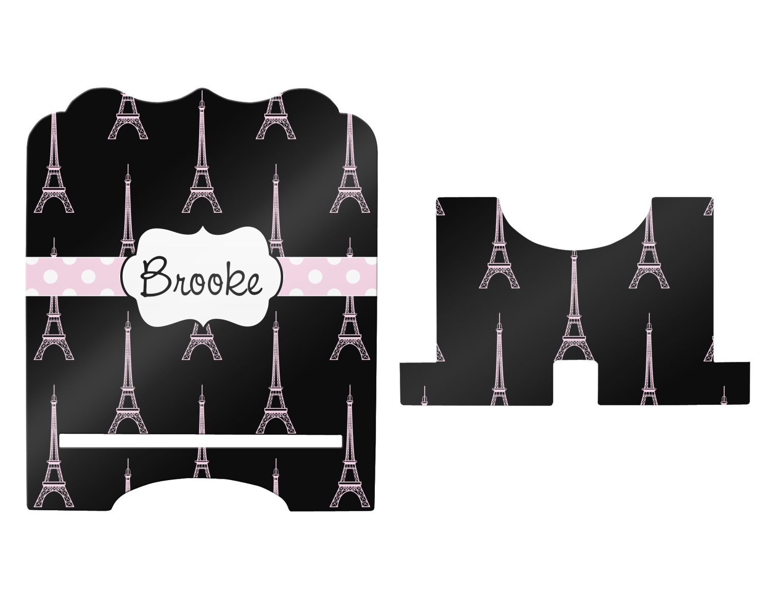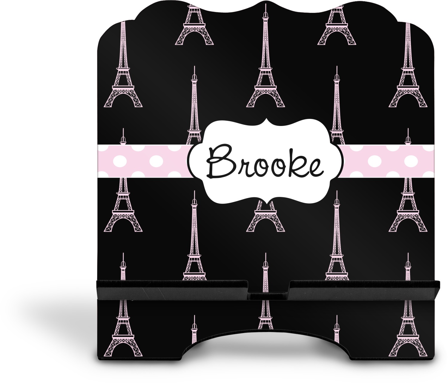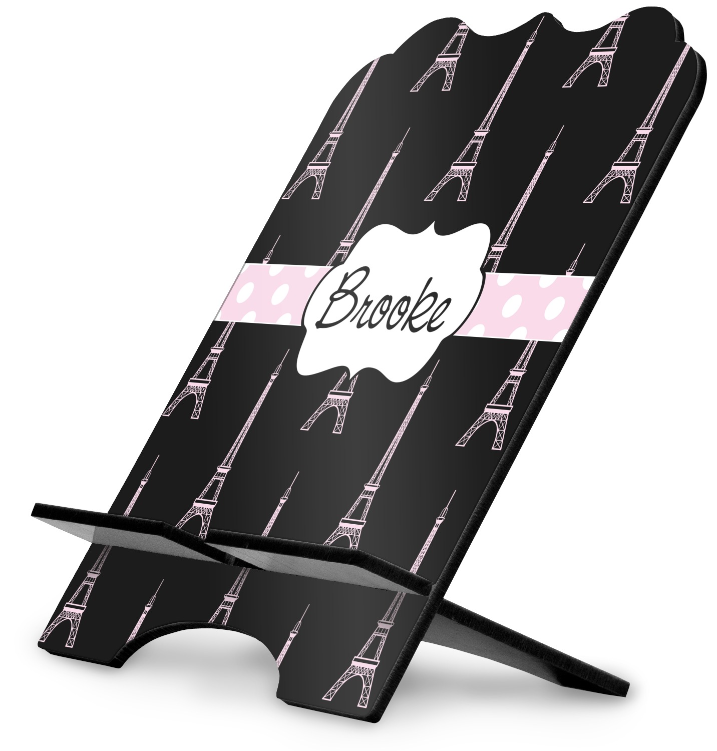The stand is comprised of two hardboard pieces that fit snugly together and stabilize one another. The bottom part of the iPad stand supports your tablet, and has space for your tablets charger while in use. At 9.25" x 11.5", this tablet mount can support a device between the sizes of the iPad Pro and the iPad Mini 2. The uppermost part of the stand features a decorative, curved edge for a classy, suave appearance. We print your customization atop the face of the stand, in vibrant color. The remaining sides are colored a sleek black.