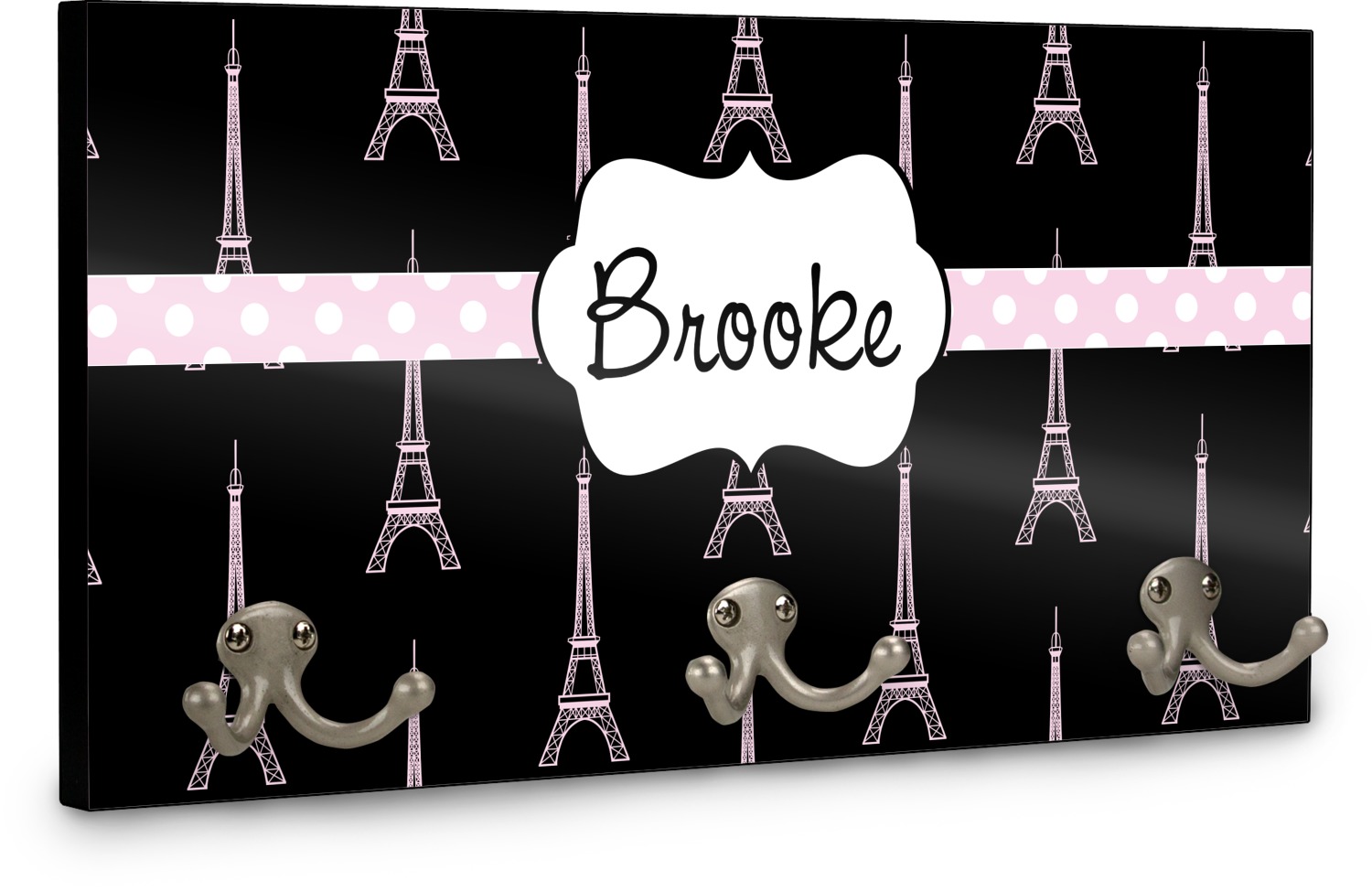 This coat rack is the perfect way to add some personality to your wall or entryway. The board is made of a strong maple that is approximately 16" x 8". The three 2-prong hooks are a sturdy metal that have three screws attaching them to the board. Your design is printed right onto the front of the board while the back and sides are a simple black.