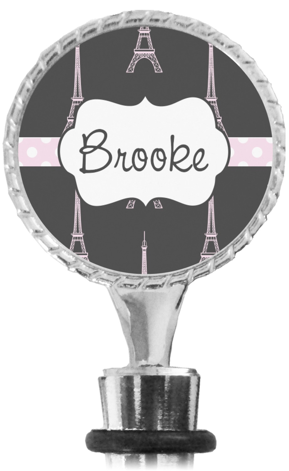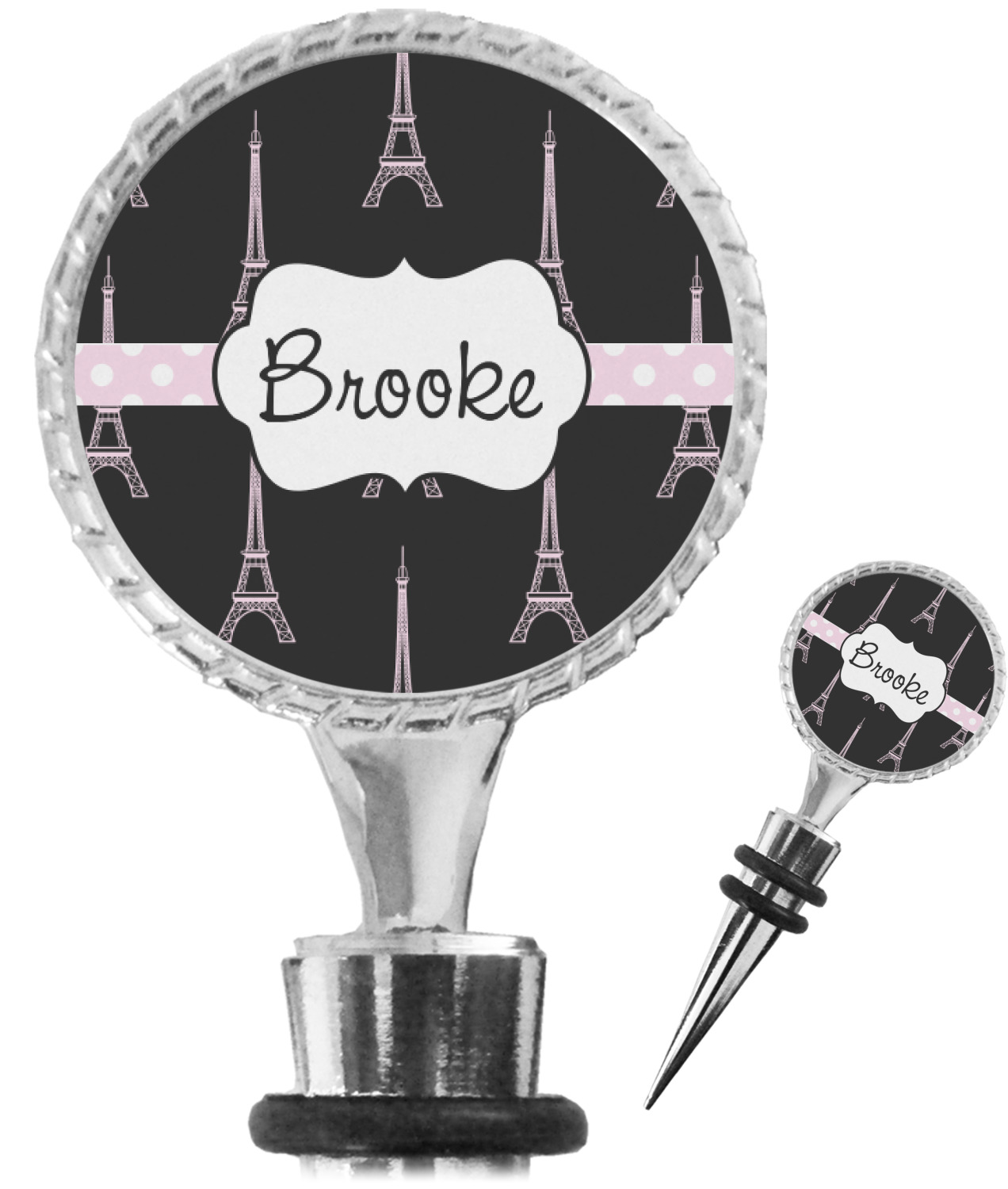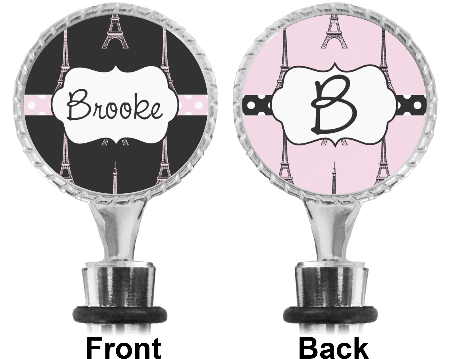 The top part of your bottle stopper is comprised of a zinc ring that displays your customization(s) in its middle, on both sides. The ring is heavy duty, with a bright chrome finish. The body of the wine stoppers have two silicone rings to provide an airtight seal. These wine bottle stoppers measure at 1.625" L x 0.8125" W x 4.625" H; your custom wine stopper is meant to fit into most standard-sized wine bottles.