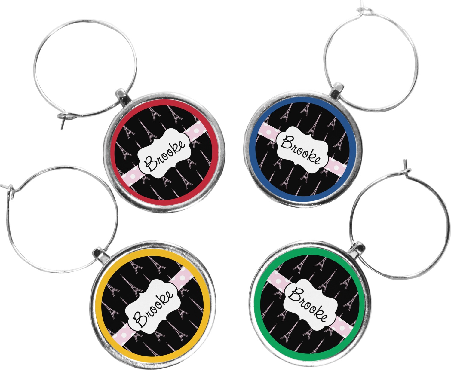 Your wine glass markers are comprised of a circular zinc plate with a 1.25 inch diameter. The zinc plate hangs from a zinc loop, which can be easily secured and removed from the stem of a wine glass. Your customized design is printed onto a 1 inch diameter insert, and then placed into the wine glass charm itself. Though sold in a set of four, you can personalize each charm individually and change the colors of the ring around your design, depending on your needs.