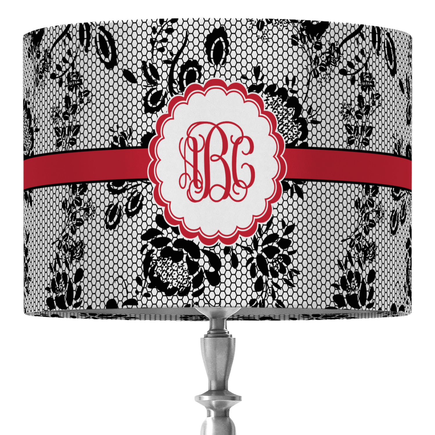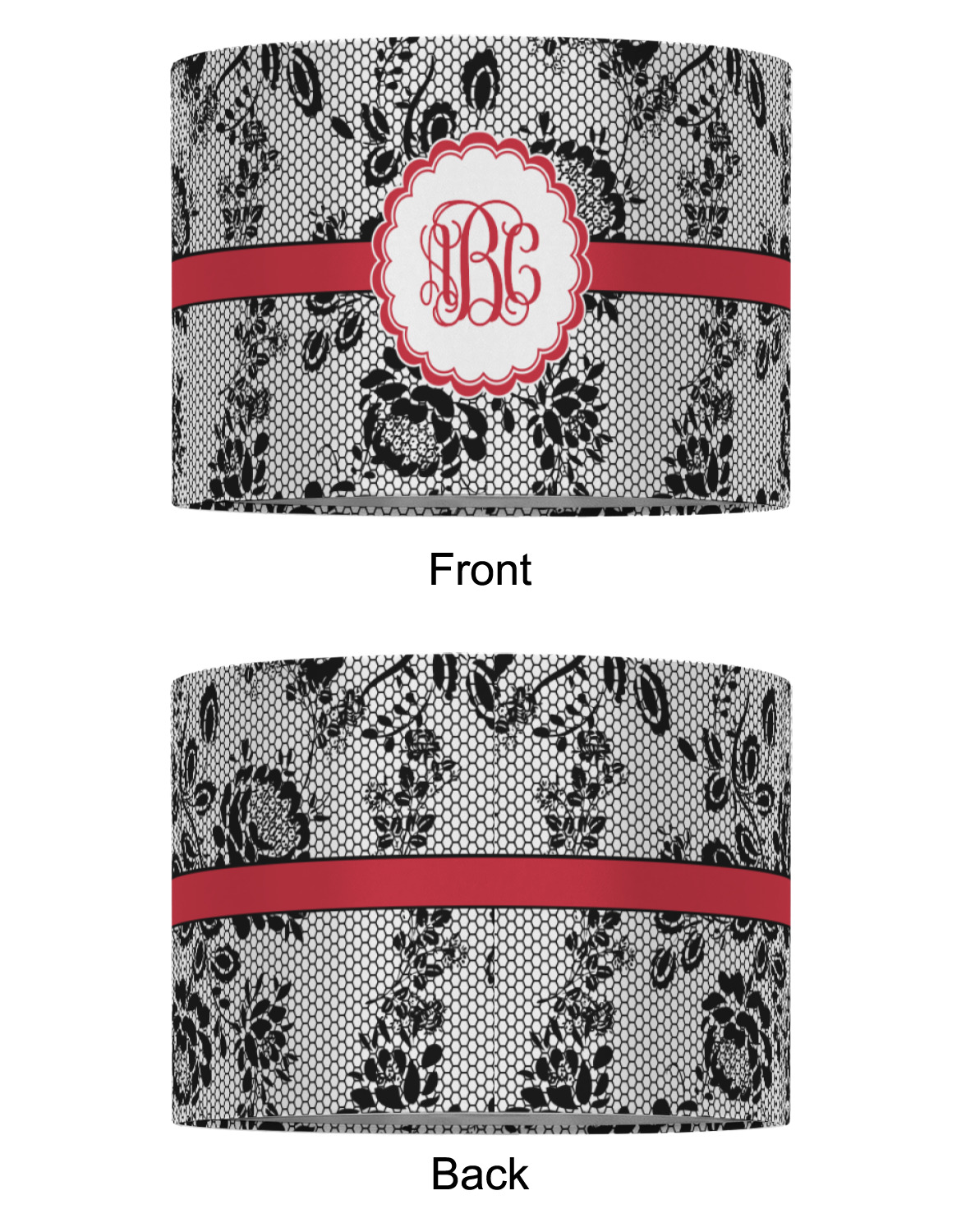 A wide red band with a thin white outline adds a punch of color. The scalloped label highlights a classic personalized monogram.