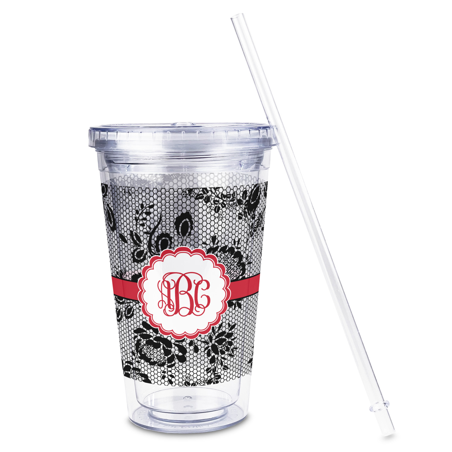 A wide red band with a thin white outline adds a punch of color. The scalloped label highlights a classic personalized monogram.