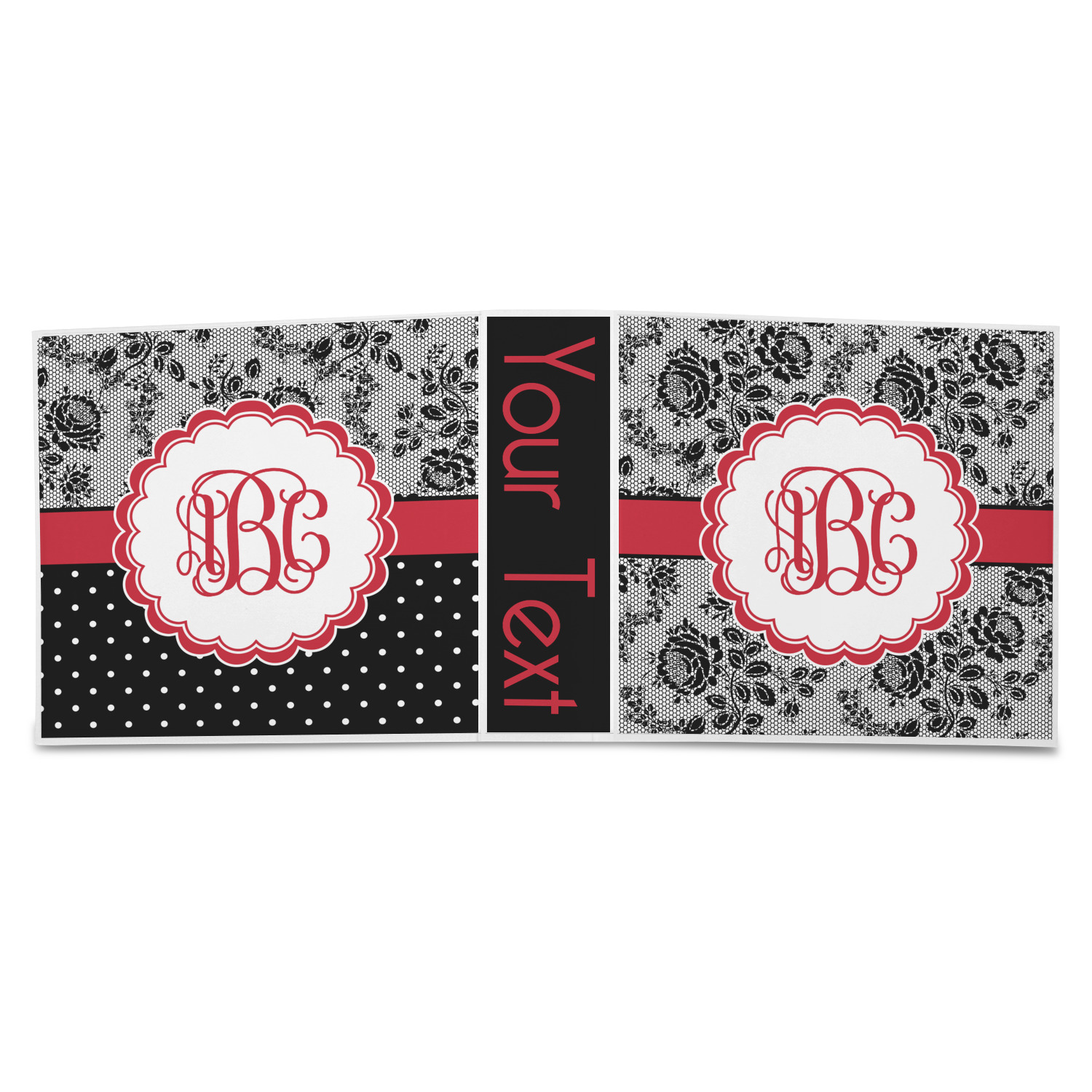 A wide red band with a thin white outline adds a punch of color. The scalloped label highlights a classic personalized monogram.