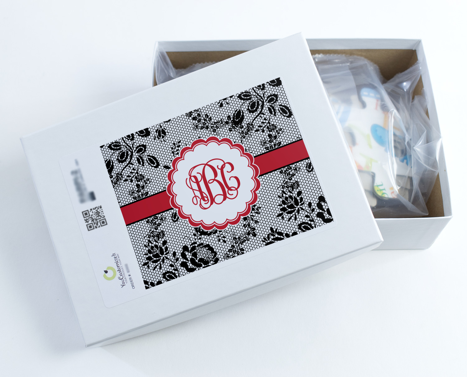 A wide red band with a thin white outline adds a punch of color. The scalloped label highlights a classic personalized monogram.