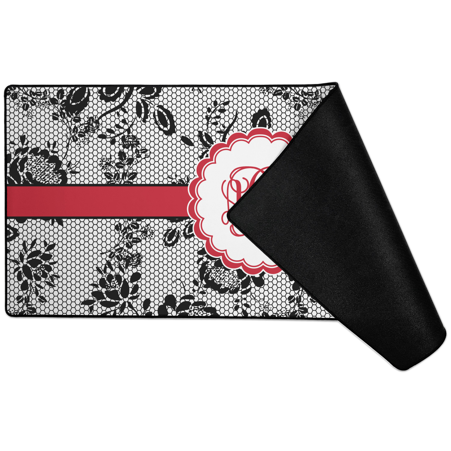 A wide red band with a thin white outline adds a punch of color. The scalloped label highlights a classic personalized monogram.