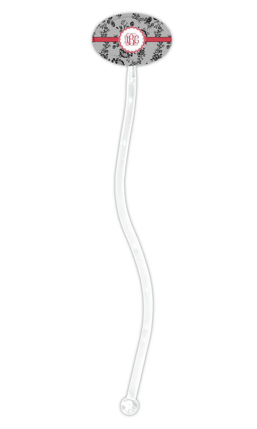A wide red band with a thin white outline adds a punch of color. The scalloped label highlights a classic personalized monogram.
