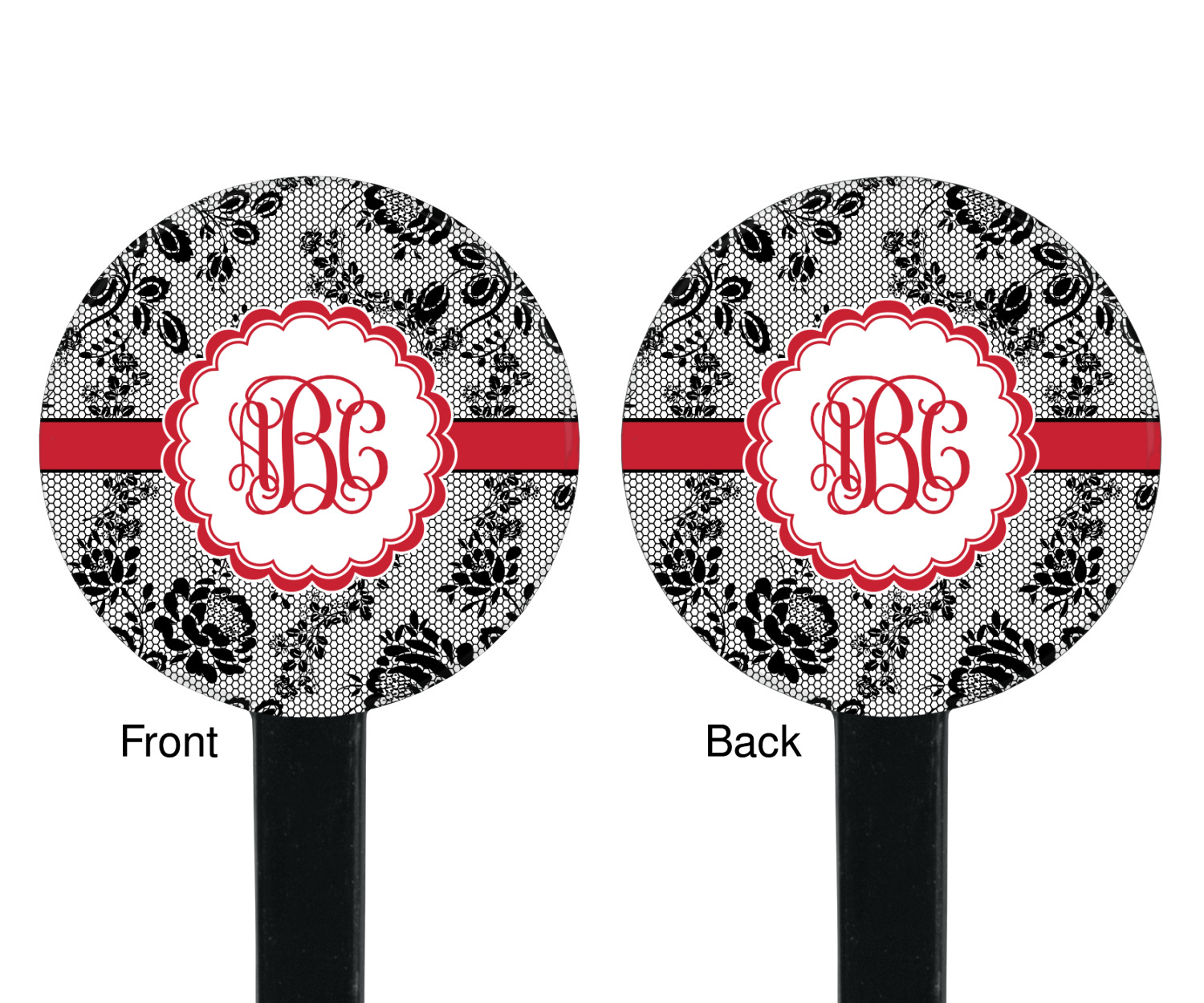 A wide red band with a thin white outline adds a punch of color. The scalloped label highlights a classic personalized monogram.