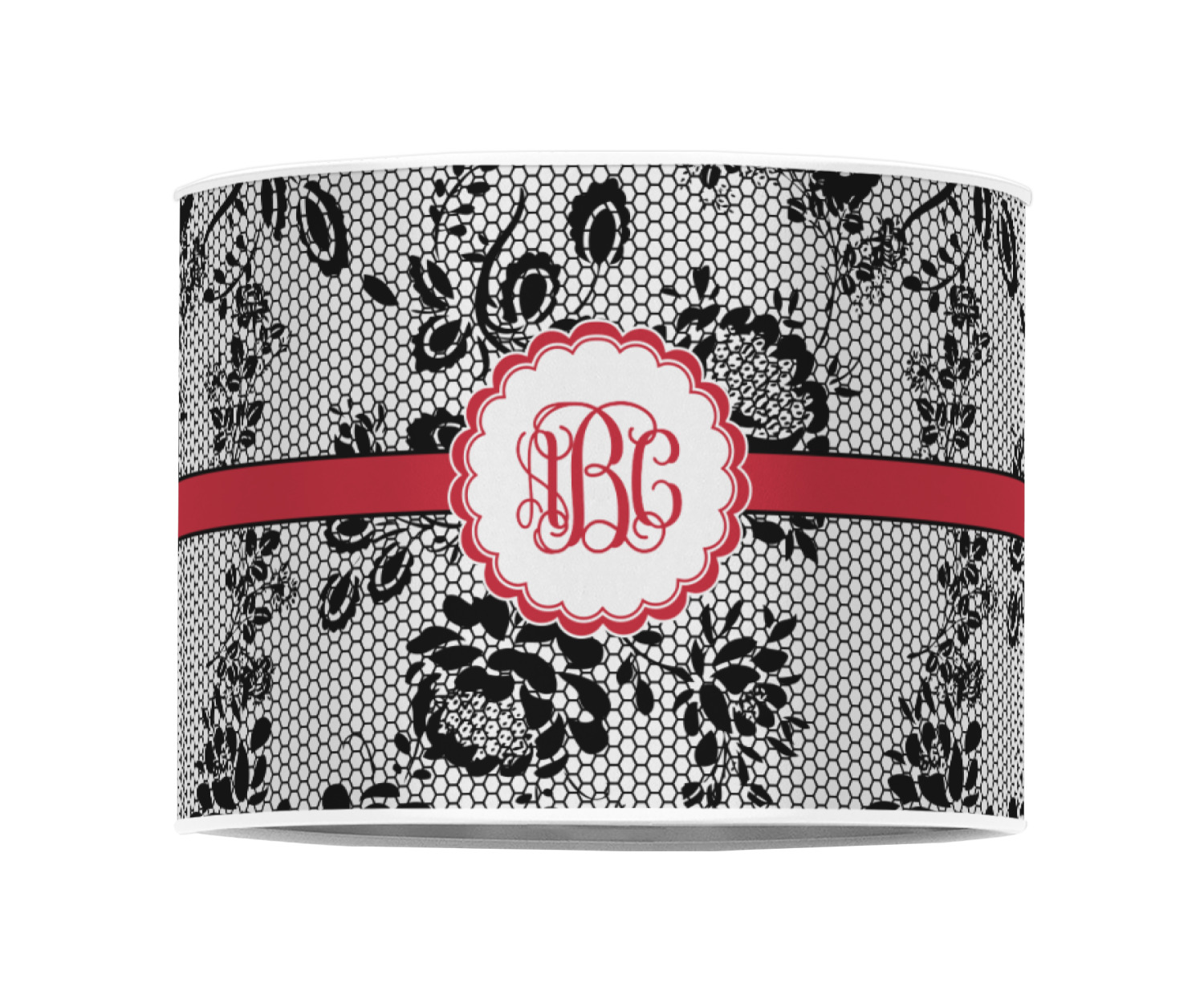 A wide red band with a thin white outline adds a punch of color. The scalloped label highlights a classic personalized monogram.