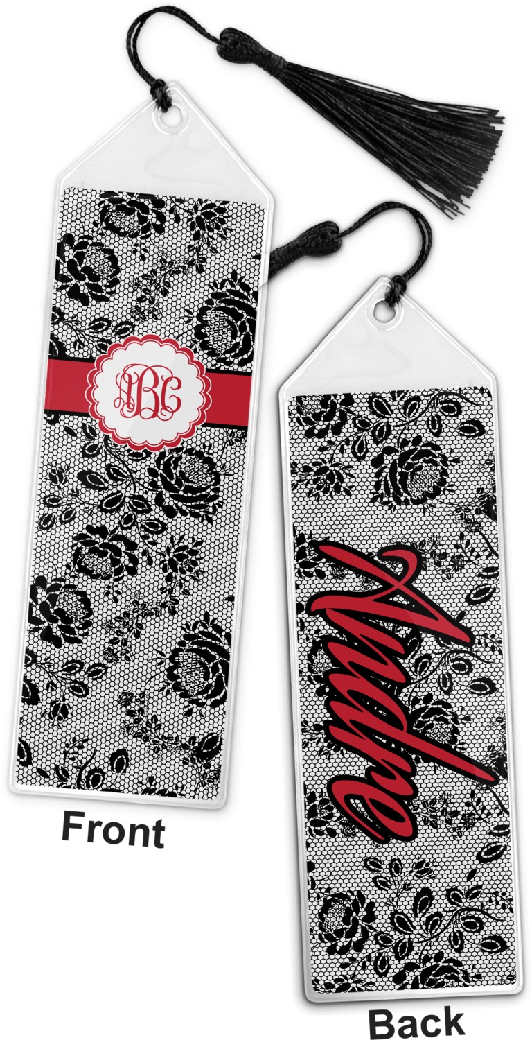 Your personalized bookmark is made of a sturdy, clear vinyl, and is approximately 7.5" x 2.25". We display your personalization on vinyl inserts that are placed on both sides. Accompanying each book marker is a black, fringe tassel that attaches to the reinforced, triangular header.