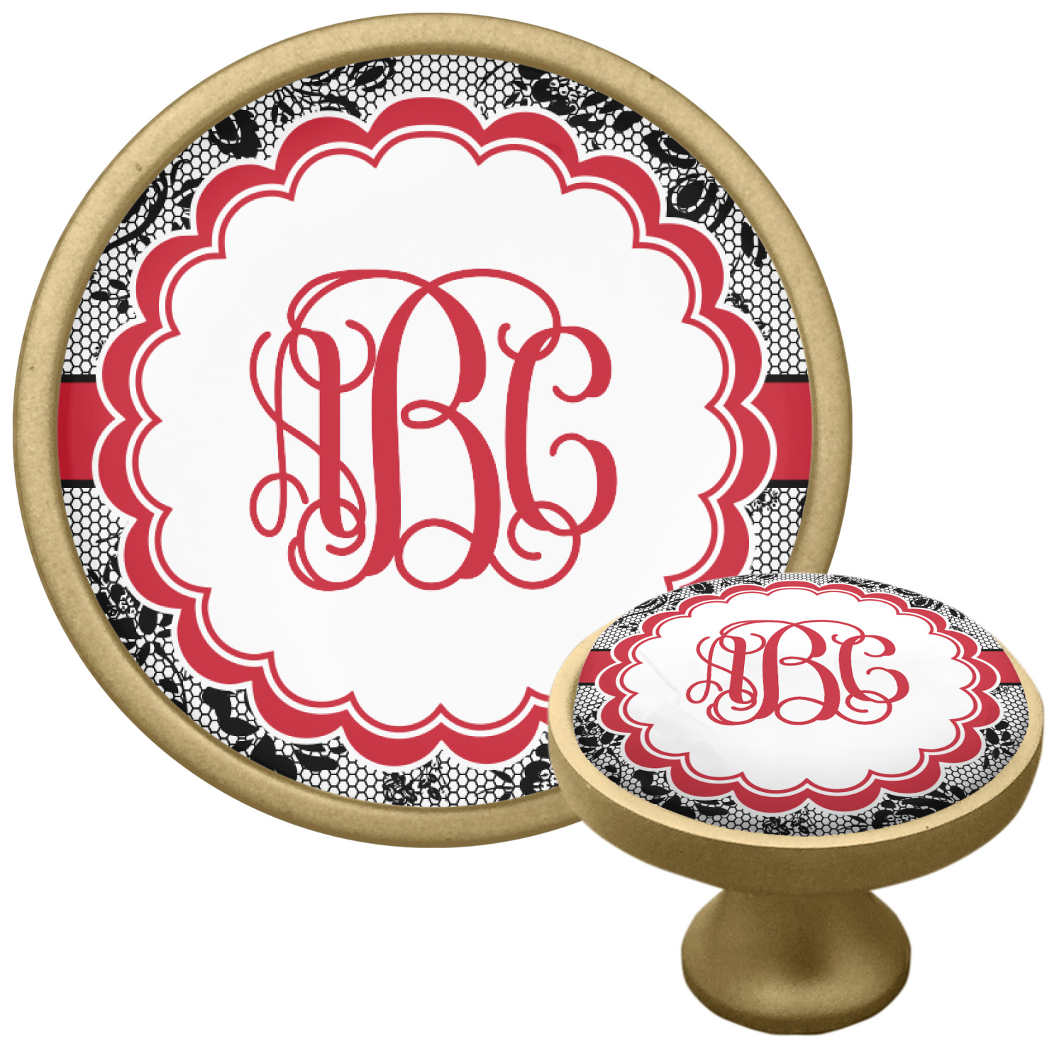 A wide red band with a thin white outline adds a punch of color. The scalloped label highlights a classic personalized monogram.