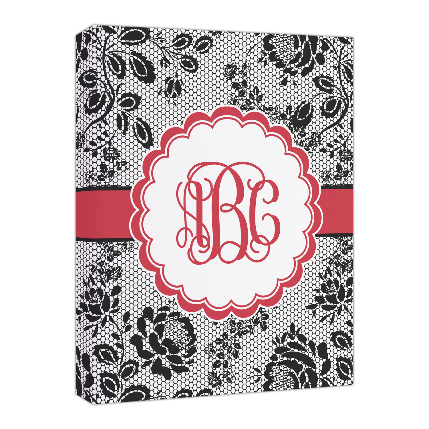 A wide red band with a thin white outline adds a punch of color. The scalloped label highlights a classic personalized monogram.