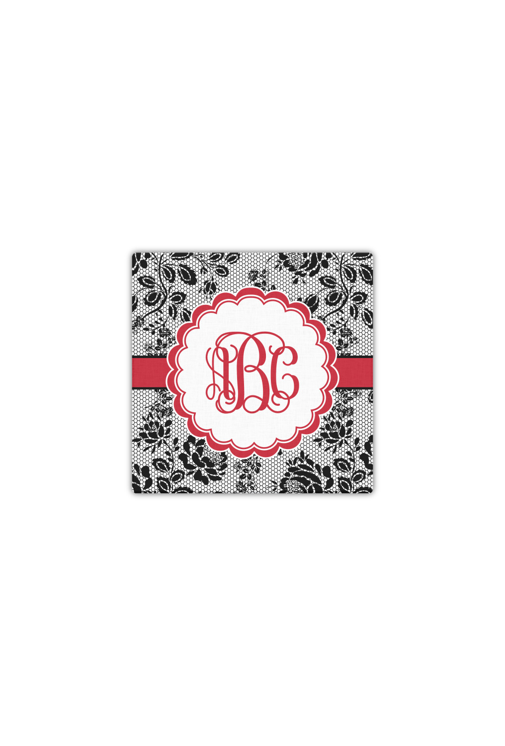 A wide red band with a thin white outline adds a punch of color. The scalloped label highlights a classic personalized monogram.